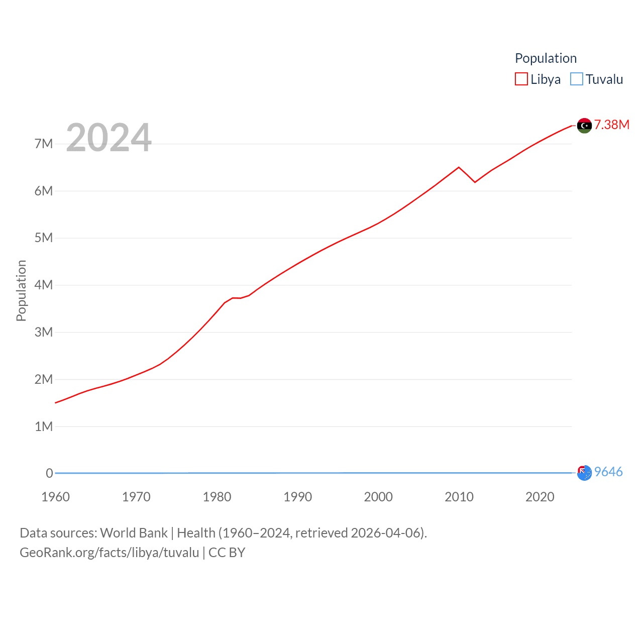 Libya has a population of 7.38M (ranked 105/197), compared with 9.65K in Tuvalu (ranked 196/197). Libya's land area is 679,362 sq mi versus 11.6 sq mi for Tuvalu (ranked 16th vs. 194th).