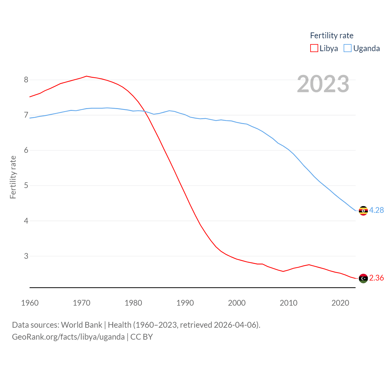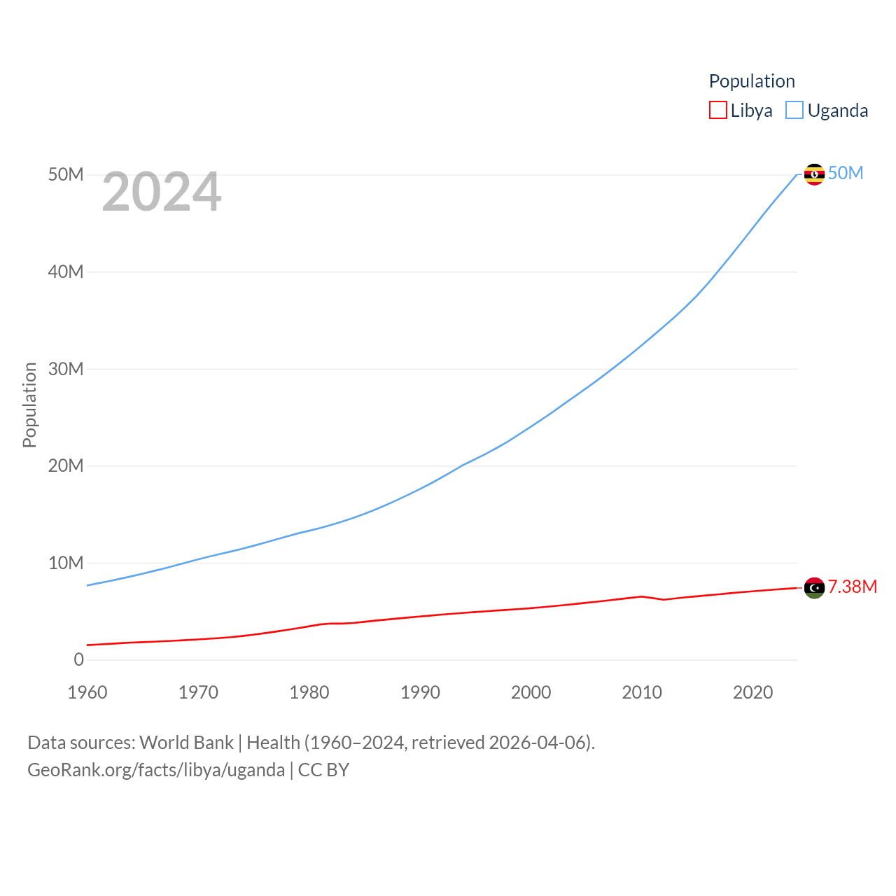 Libya has a population of 7.38M (ranked 105/197), compared with 50M in Uganda (ranked 31/197). Libya's land area is 679,362 sq mi versus 77,421 sq mi for Uganda (ranked 16th vs. 84th).