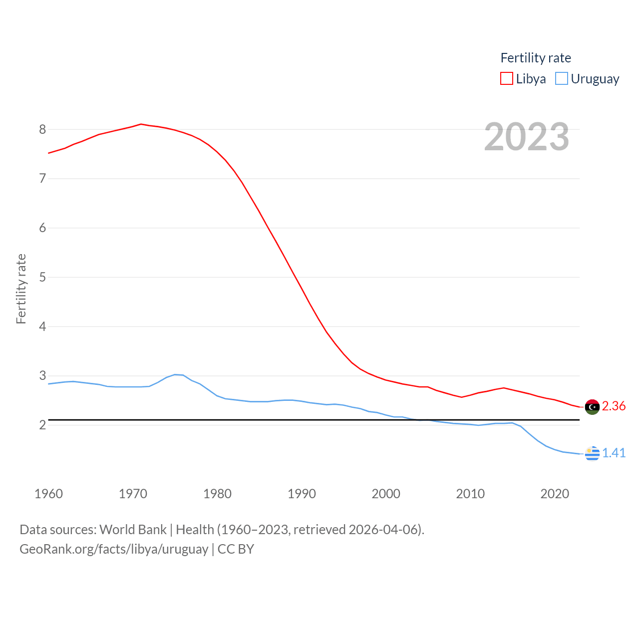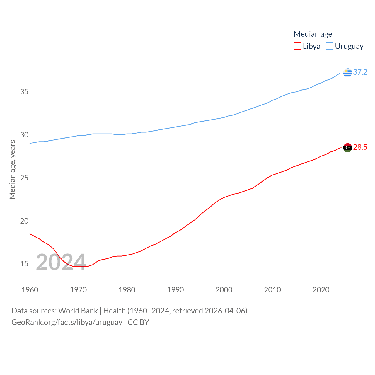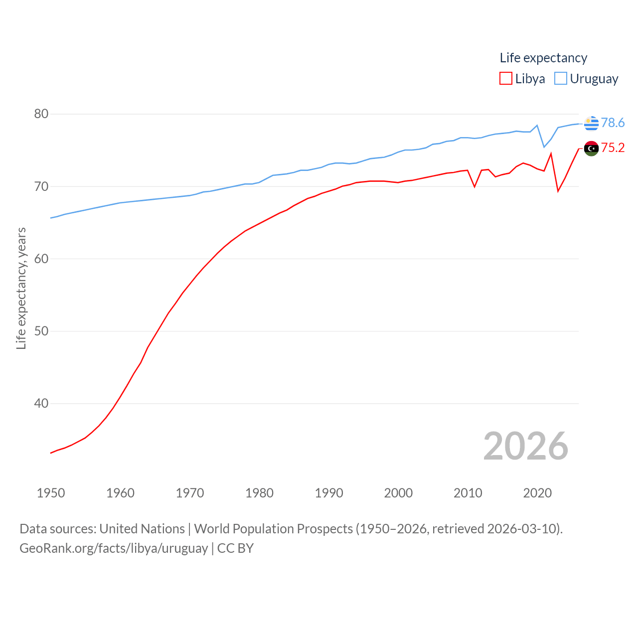 Libya has a population of 7.38M (ranked 105/197), compared with 3.39M in Uruguay (ranked 133/197). Libya's land area is 679,362 sq mi versus 67,576 sq mi for Uruguay (ranked 16th vs. 89th).