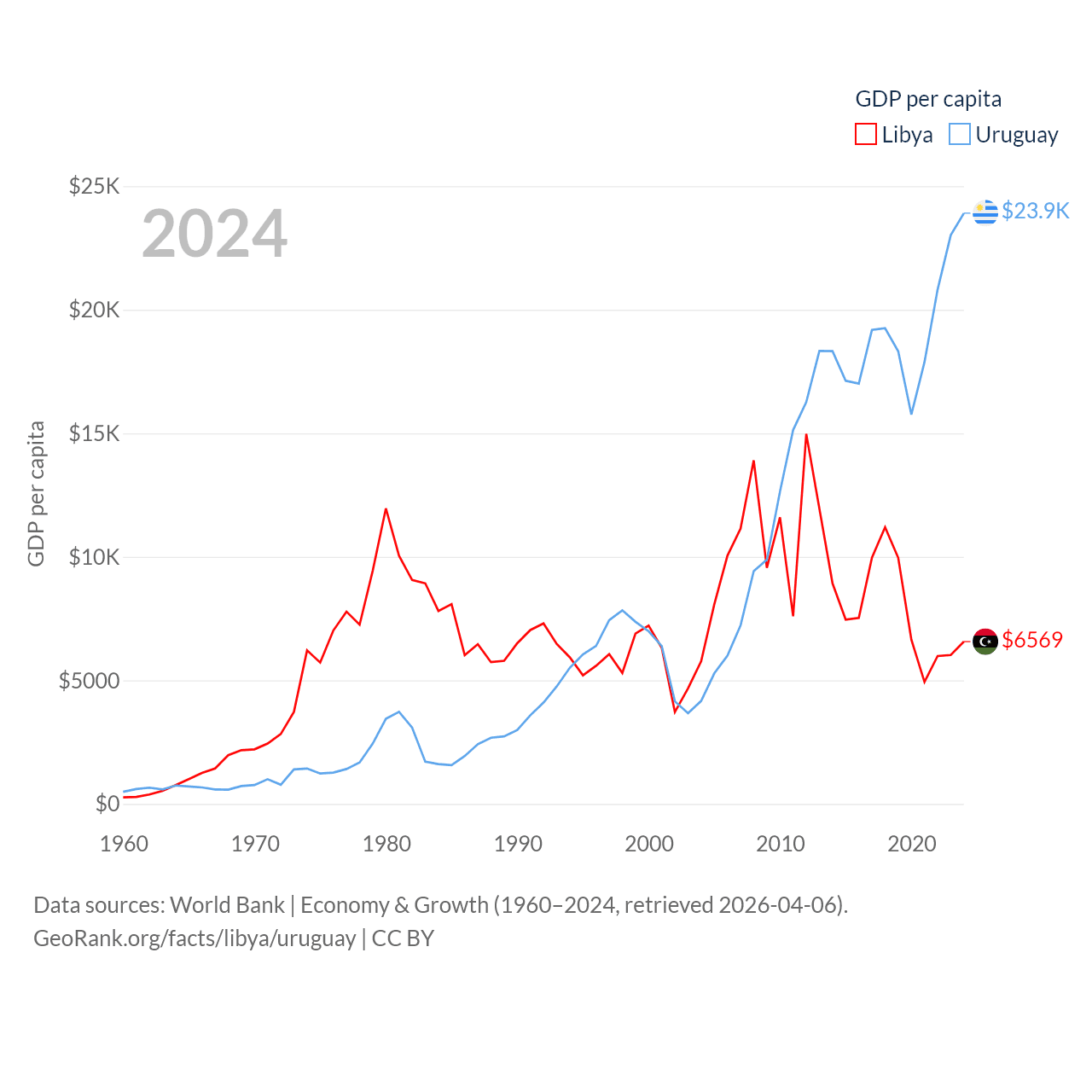 By GDP, Libya ranks 95/197 ($48.5B) and Uruguay ranks 81/197 ($81B). By GDP per capita, Libya ranks 107/197 ($6,569), while Uruguay ranks 52/197 ($23,907).