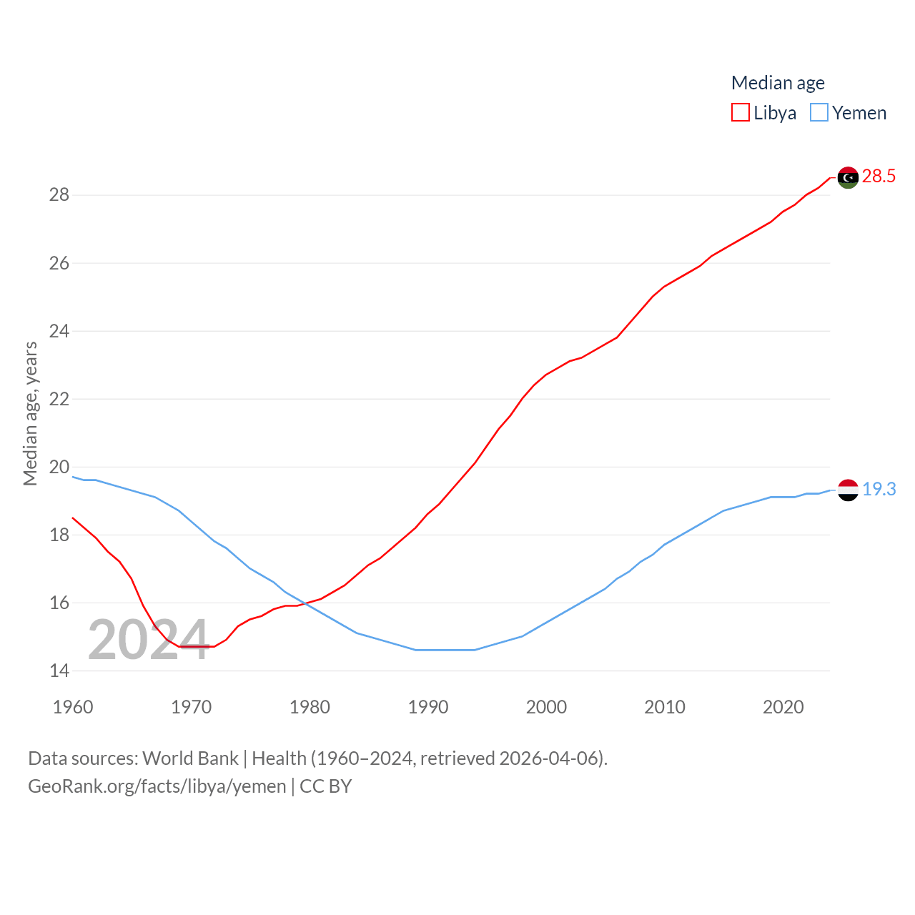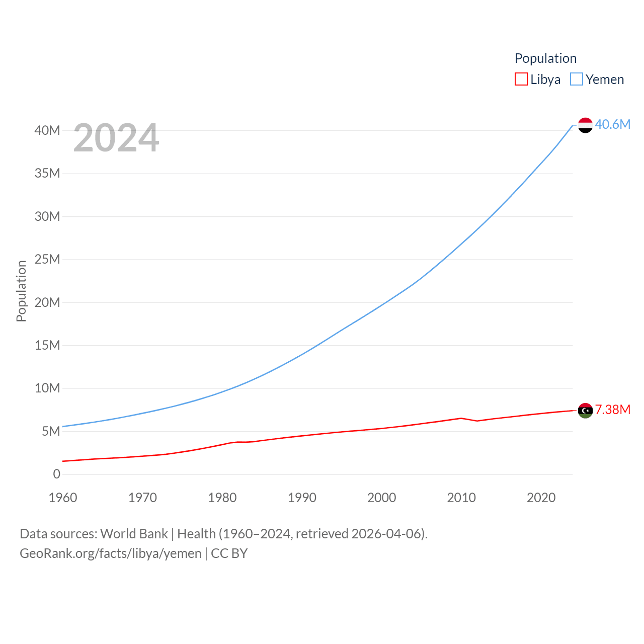 Libya has a population of 7.38M (ranked 105/197), compared with 40.6M in Yemen (ranked 38/197). Libya's land area is 679,362 sq mi versus 203,850 sq mi for Yemen (ranked 16th vs. 49th).
