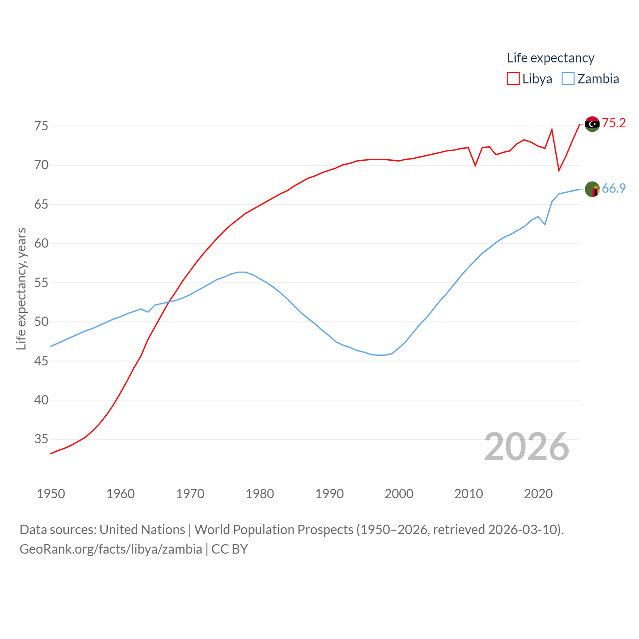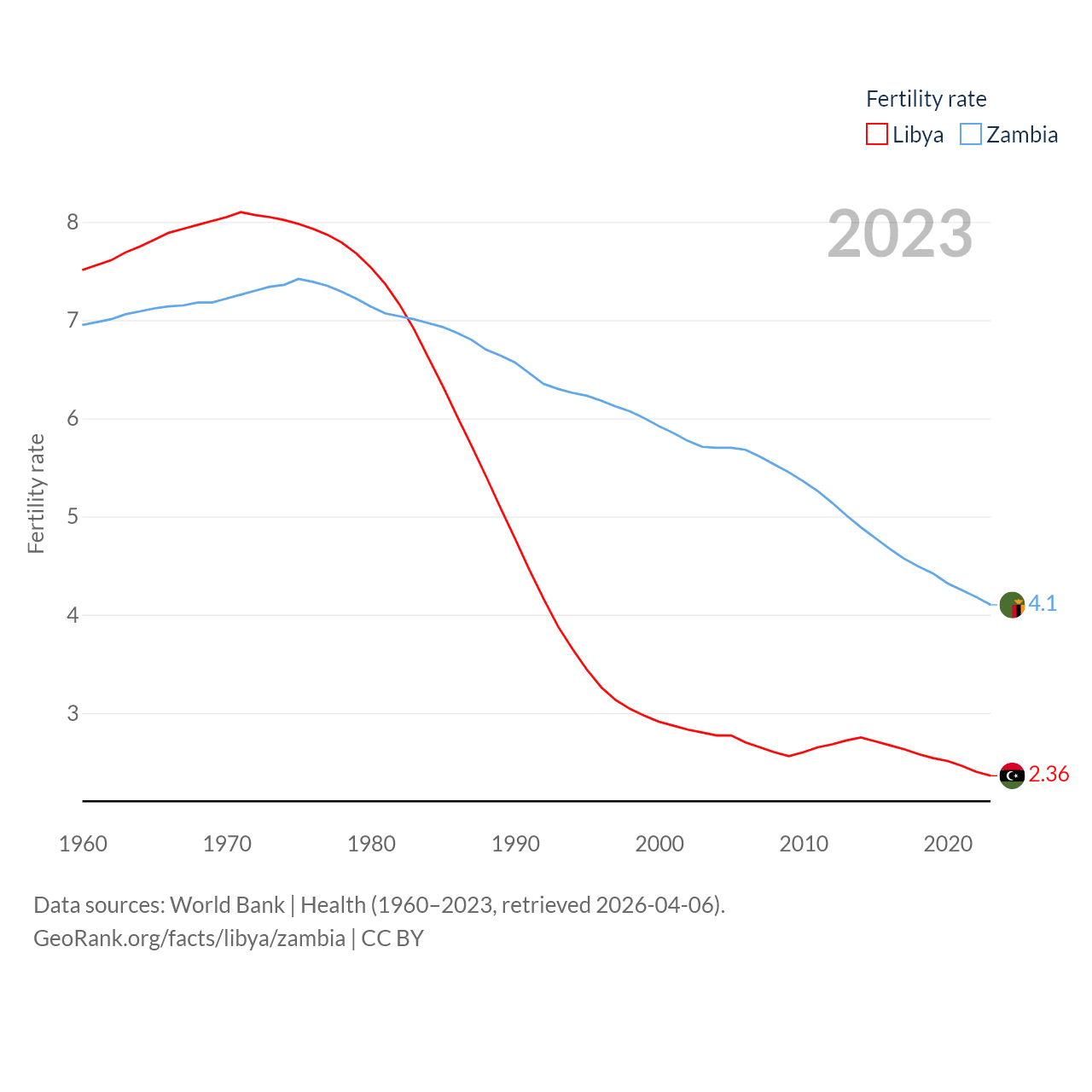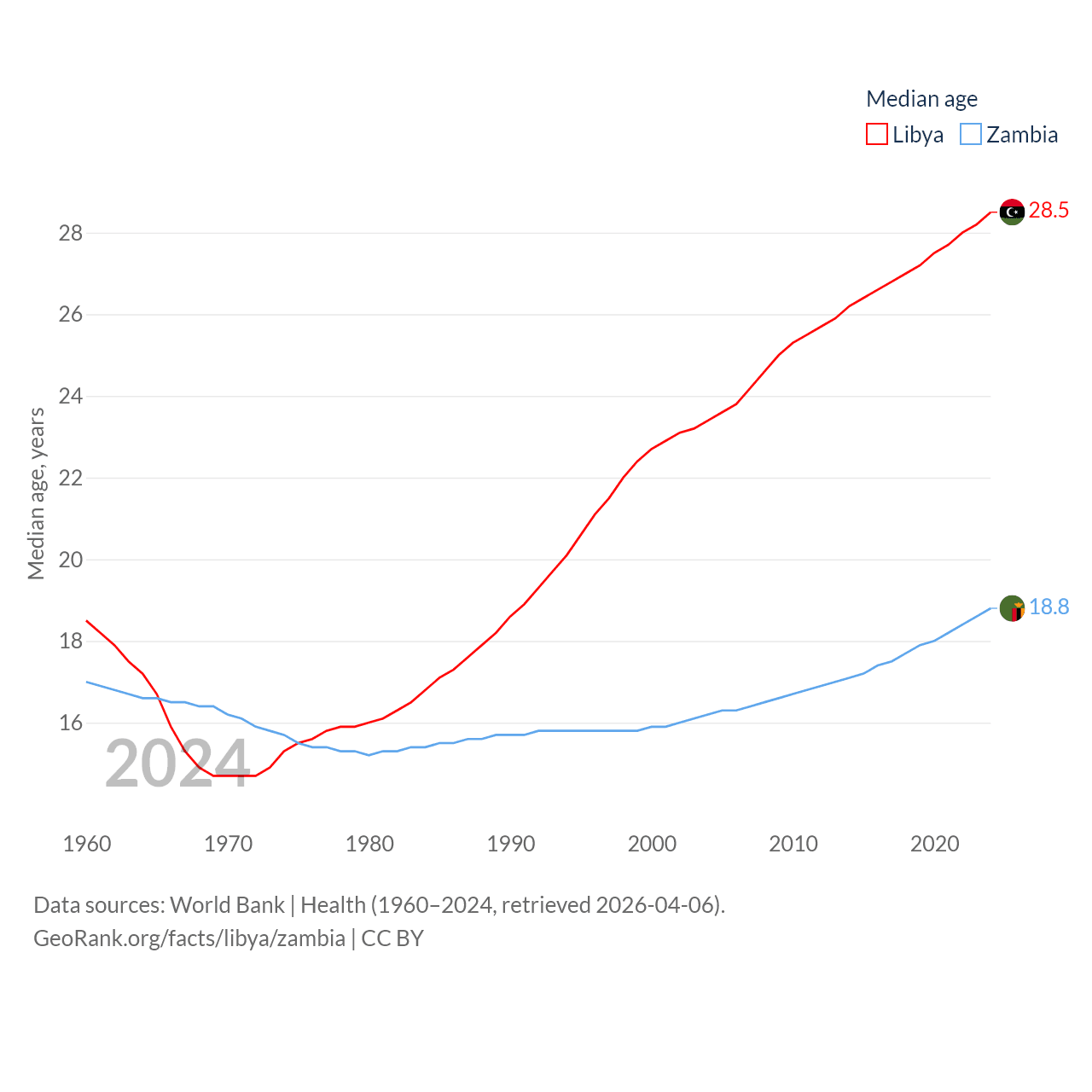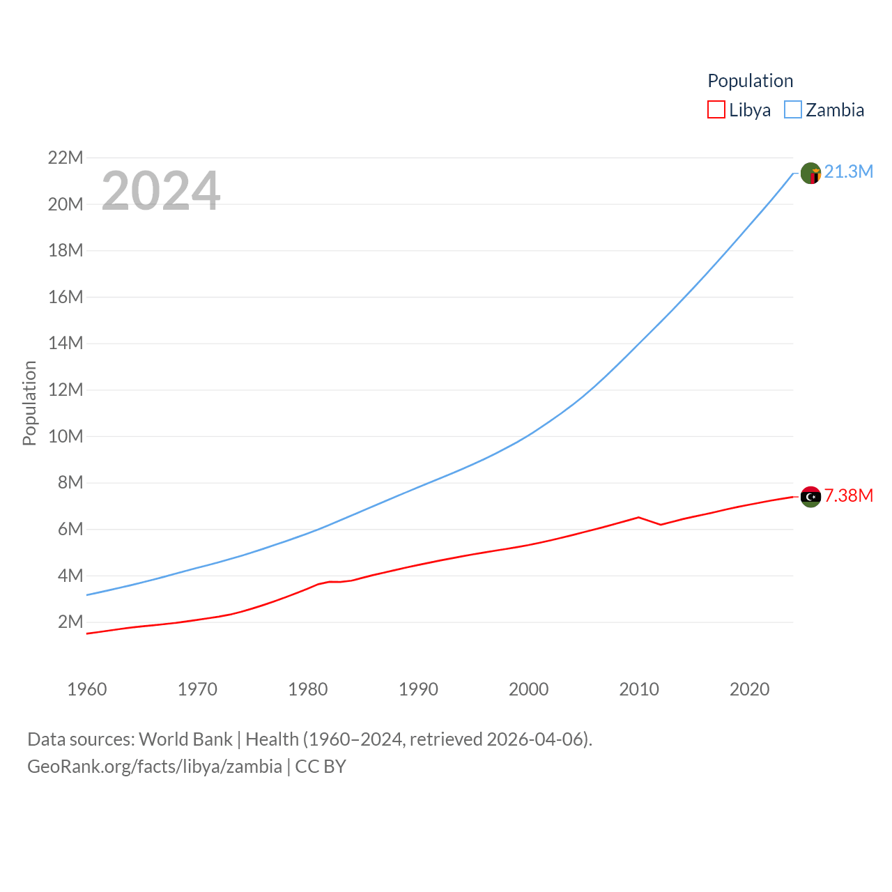 Libya has a population of 7.38M (ranked 105/197), compared with 21.3M in Zambia (ranked 63/197). Libya's land area is 679,362 sq mi versus 287,024 sq mi for Zambia (ranked 16th vs. 37th).