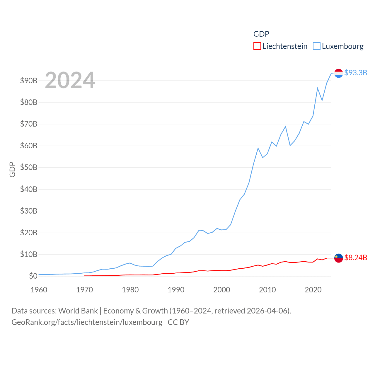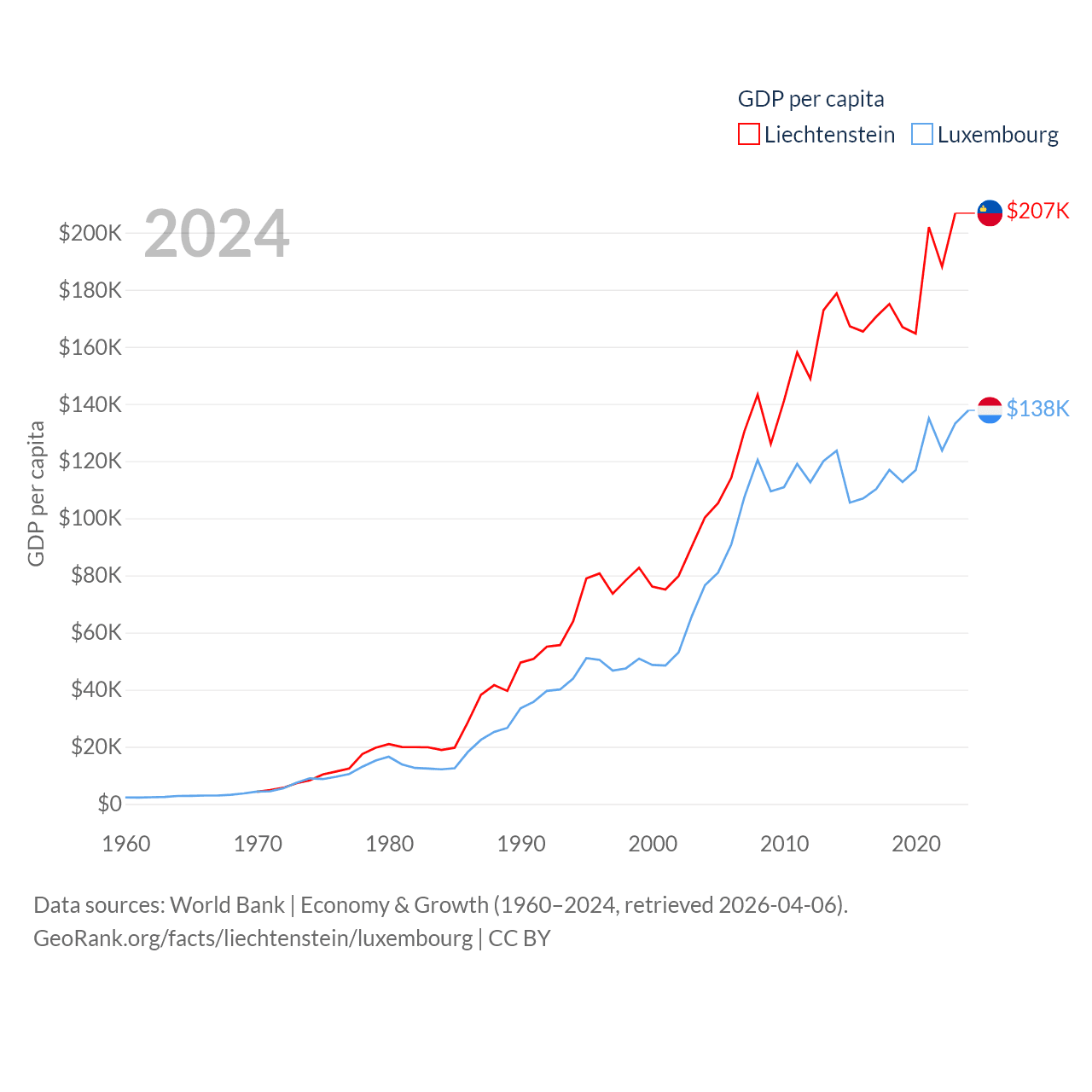 By GDP, Liechtenstein ranks 156/197 ($8.24B) and Luxembourg ranks 74/197 ($93.3B). By GDP per capita, Liechtenstein ranks 2/197 ($206,781), while Luxembourg ranks 3/197 ($137,782).