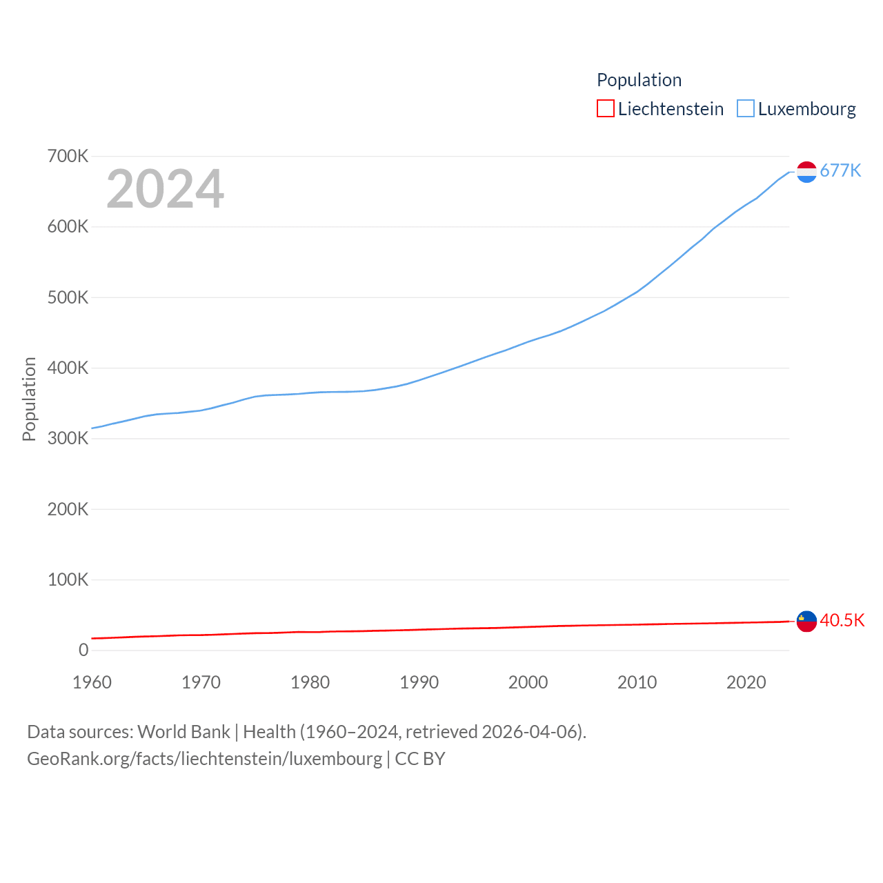 Liechtenstein has a population of 40.4K (ranked 190/197), compared with 677K in Luxembourg (ranked 164/197). Liechtenstein's land area is 61.8 sq mi versus 994 sq mi for Luxembourg (ranked 192nd vs. 169th).