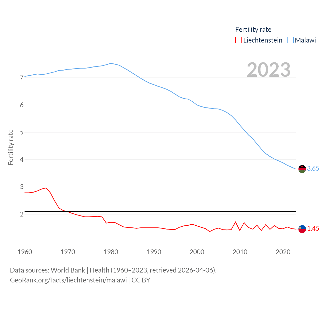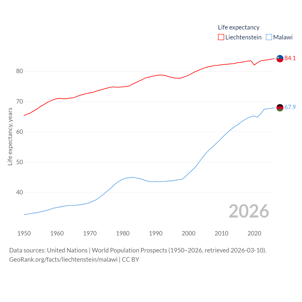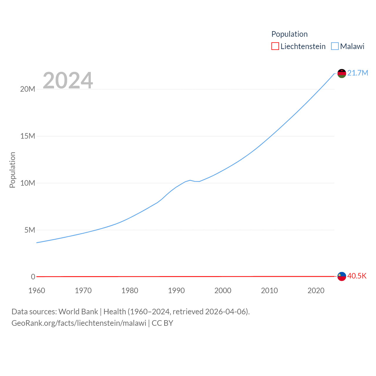 Liechtenstein has a population of 40.4K (ranked 190/197), compared with 21.7M in Malawi (ranked 62/197). Liechtenstein's land area is 61.8 sq mi versus 36,402 sq mi for Malawi (ranked 192nd vs. 107th).