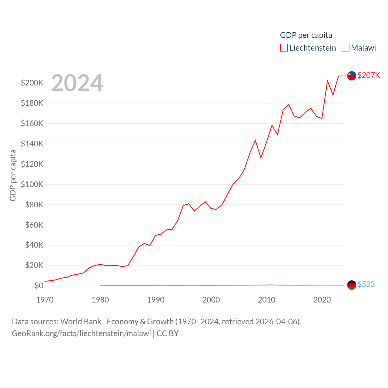 By GDP, Liechtenstein ranks 156/197 ($8.24B) and Malawi ranks 151/197 ($11.3B). By GDP per capita, Liechtenstein ranks 2/197 ($206,781), while Malawi ranks 194/197 ($523).