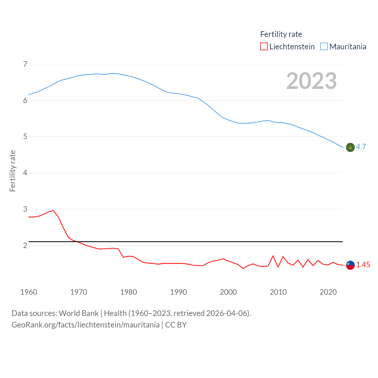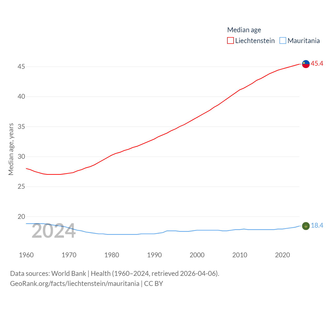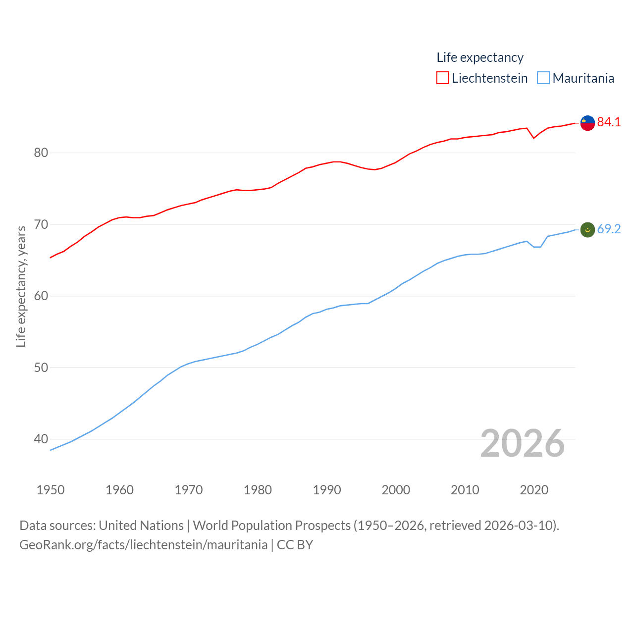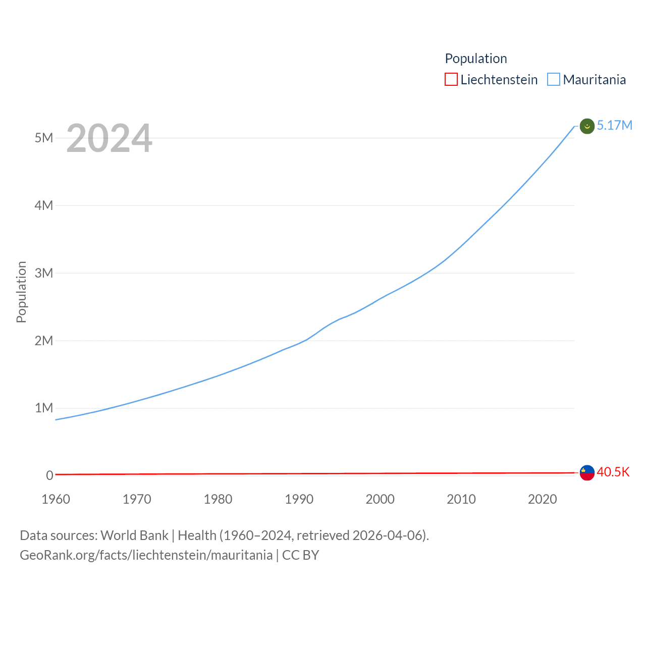 Liechtenstein has a population of 40.4K (ranked 190/197), compared with 5.17M in Mauritania (ranked 125/197). Liechtenstein's land area is 61.8 sq mi versus 397,955 sq mi for Mauritania (ranked 192nd vs. 28th).