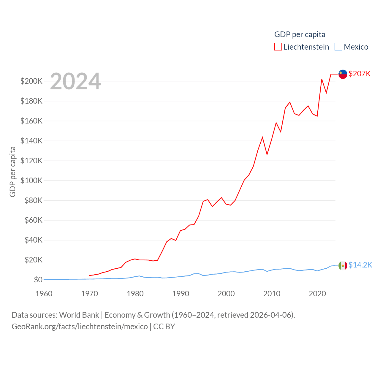 By GDP, Liechtenstein ranks 156/197 ($8.24B) and Mexico ranks 13/197 ($1.86T). By GDP per capita, Liechtenstein ranks 2/197 ($206,781), while Mexico ranks 69/197 ($14,186).