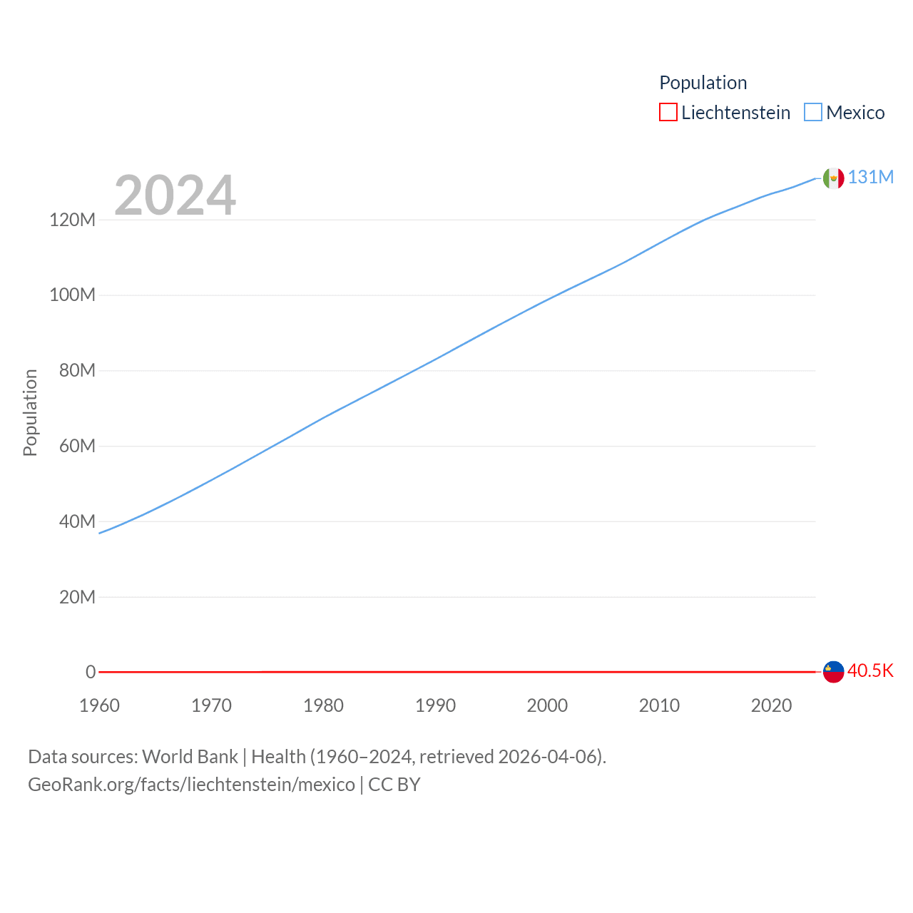 Liechtenstein has a population of 40.4K (ranked 190/197), compared with 131M in Mexico (ranked 11/197). Liechtenstein's land area is 61.8 sq mi versus 750,563 sq mi for Mexico (ranked 192nd vs. 13th).