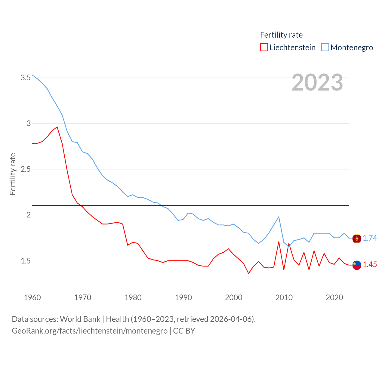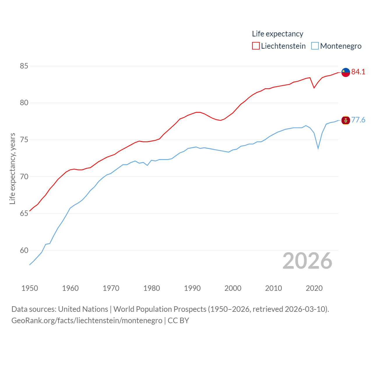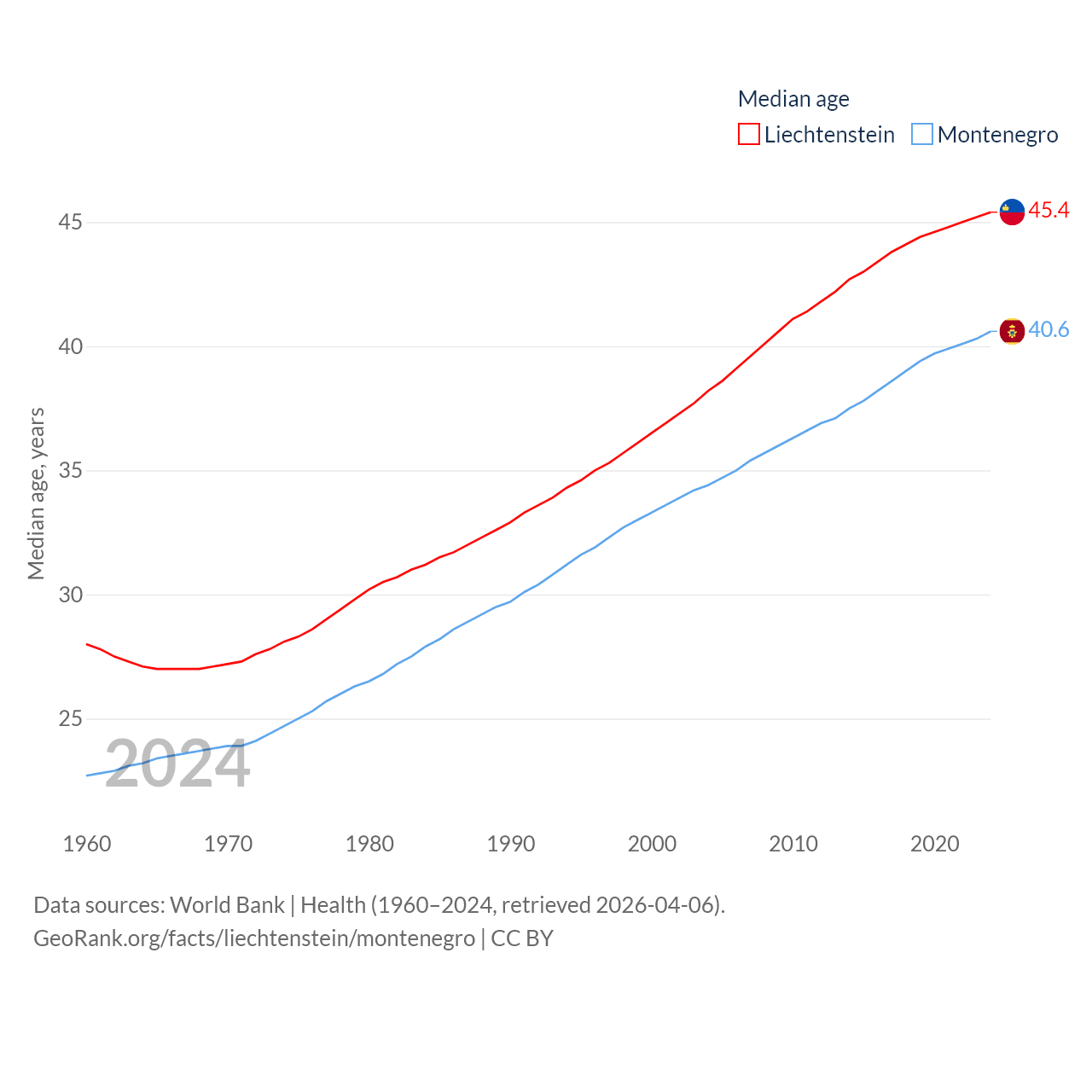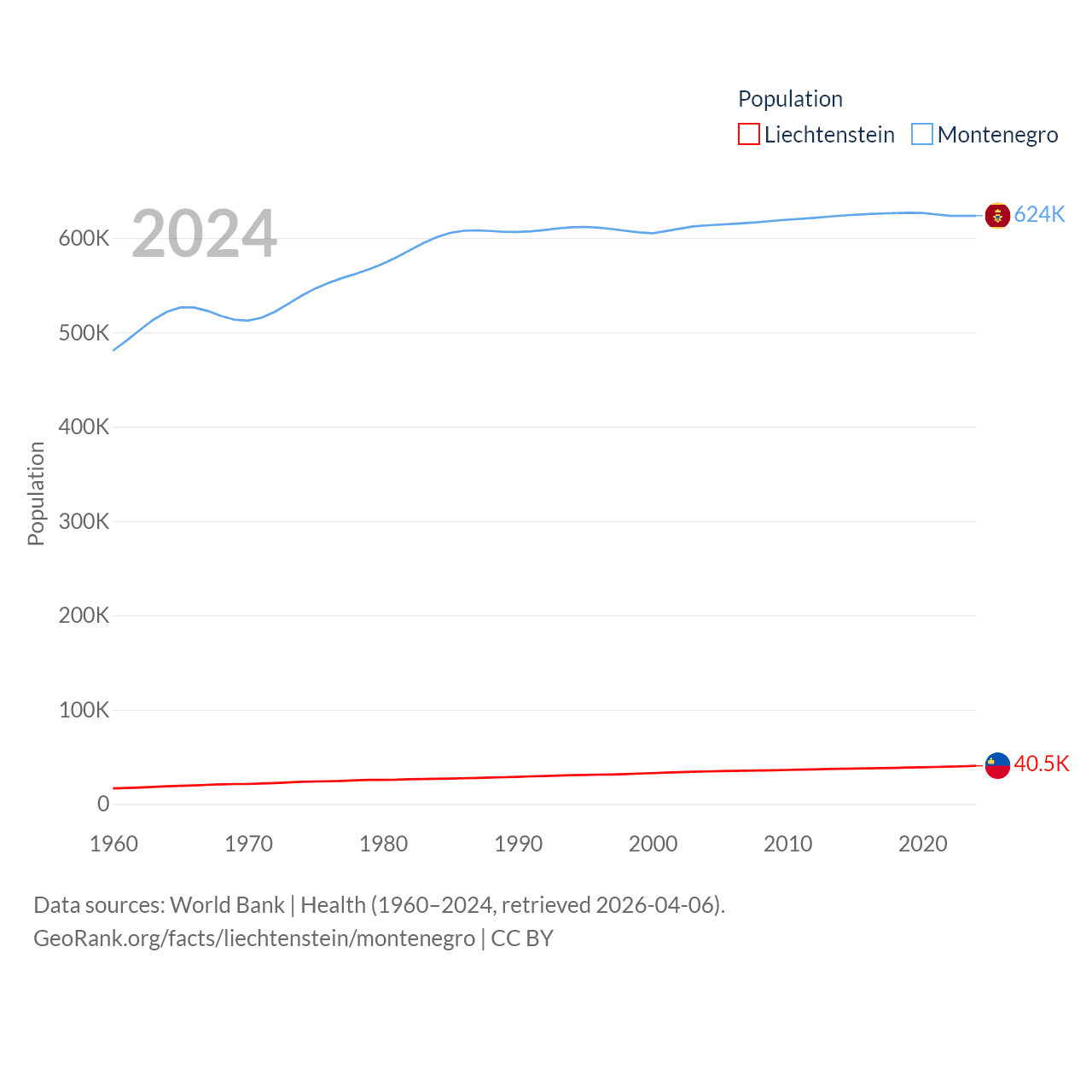 Liechtenstein has a population of 40.4K (ranked 190/197), compared with 624K in Montenegro (ranked 166/197). Liechtenstein's land area is 61.8 sq mi versus 5,193 sq mi for Montenegro (ranked 192nd vs. 156th).