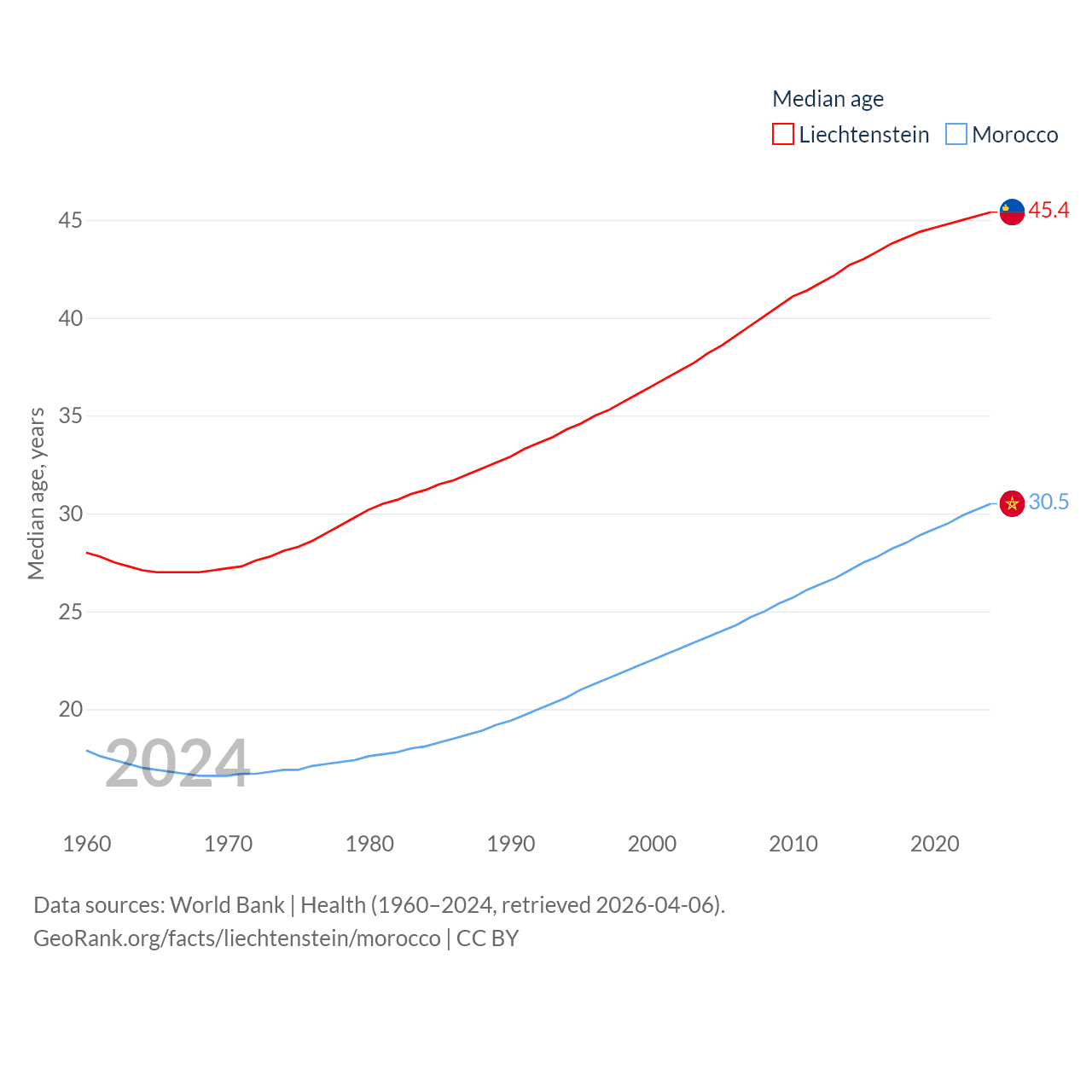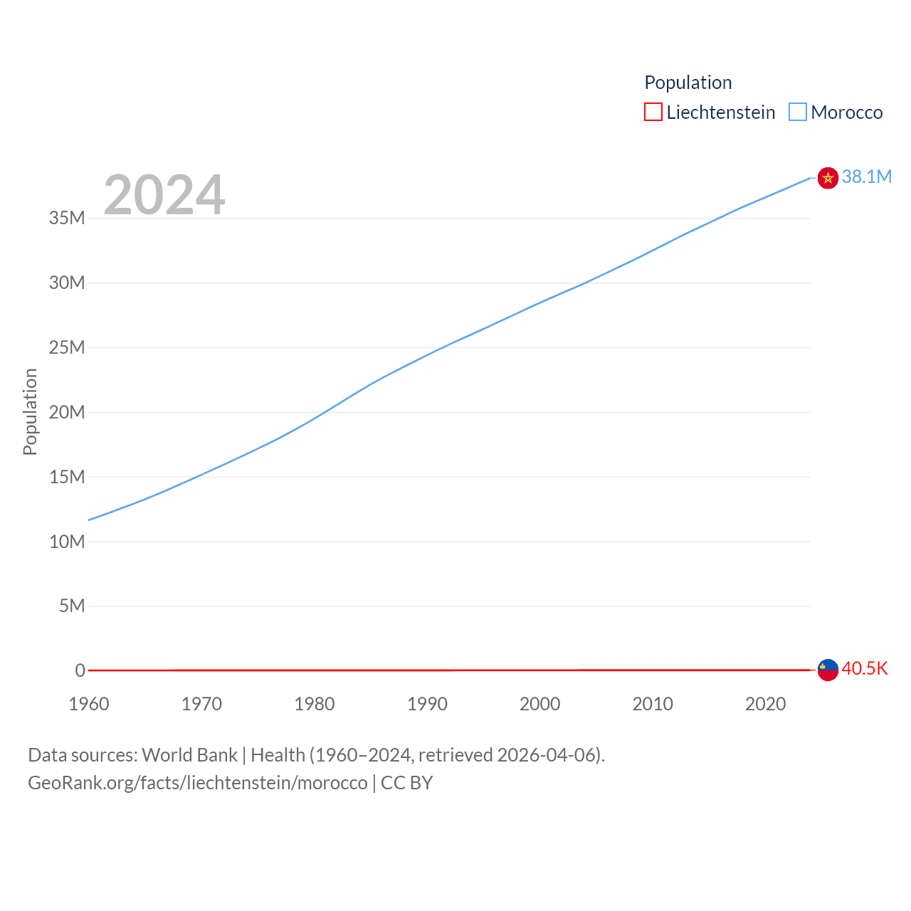 Liechtenstein has a population of 40.4K (ranked 190/197), compared with 38.1M in Morocco (ranked 39/197). Liechtenstein's land area is 61.8 sq mi versus 172,317 sq mi for Morocco (ranked 192nd vs. 55th).