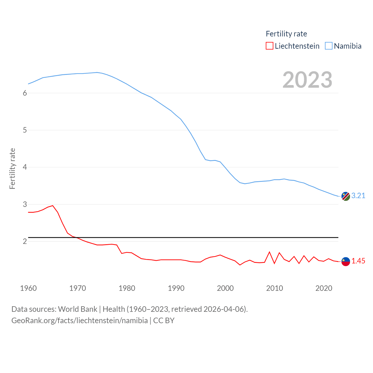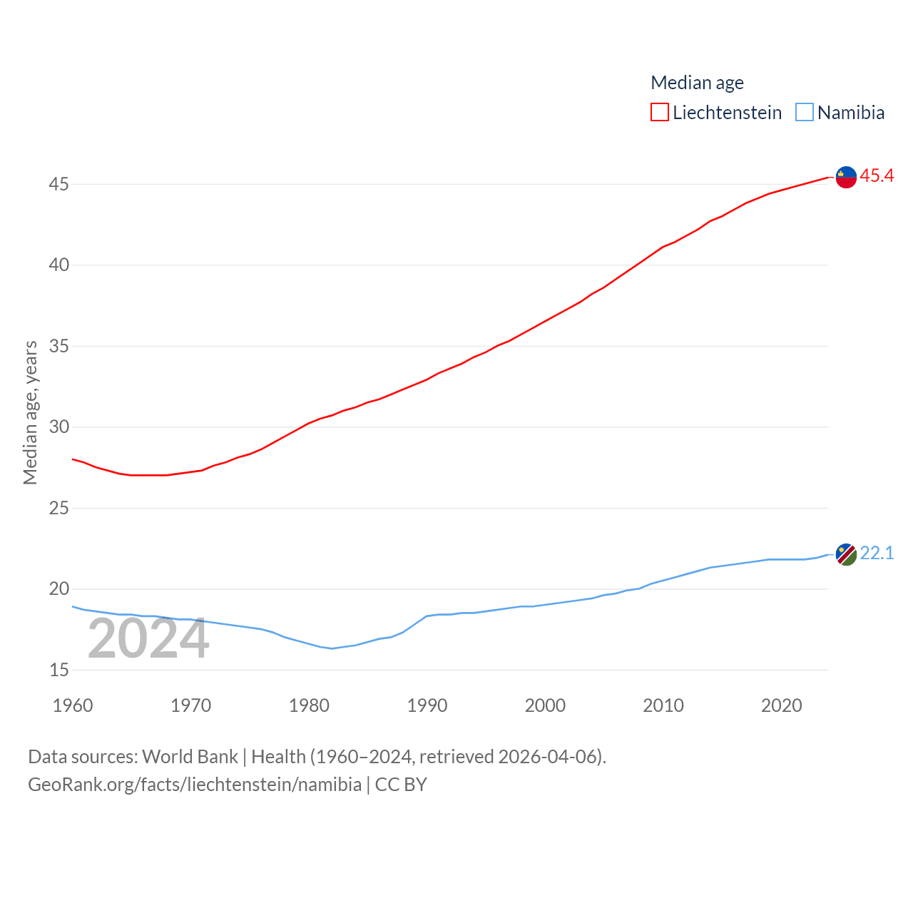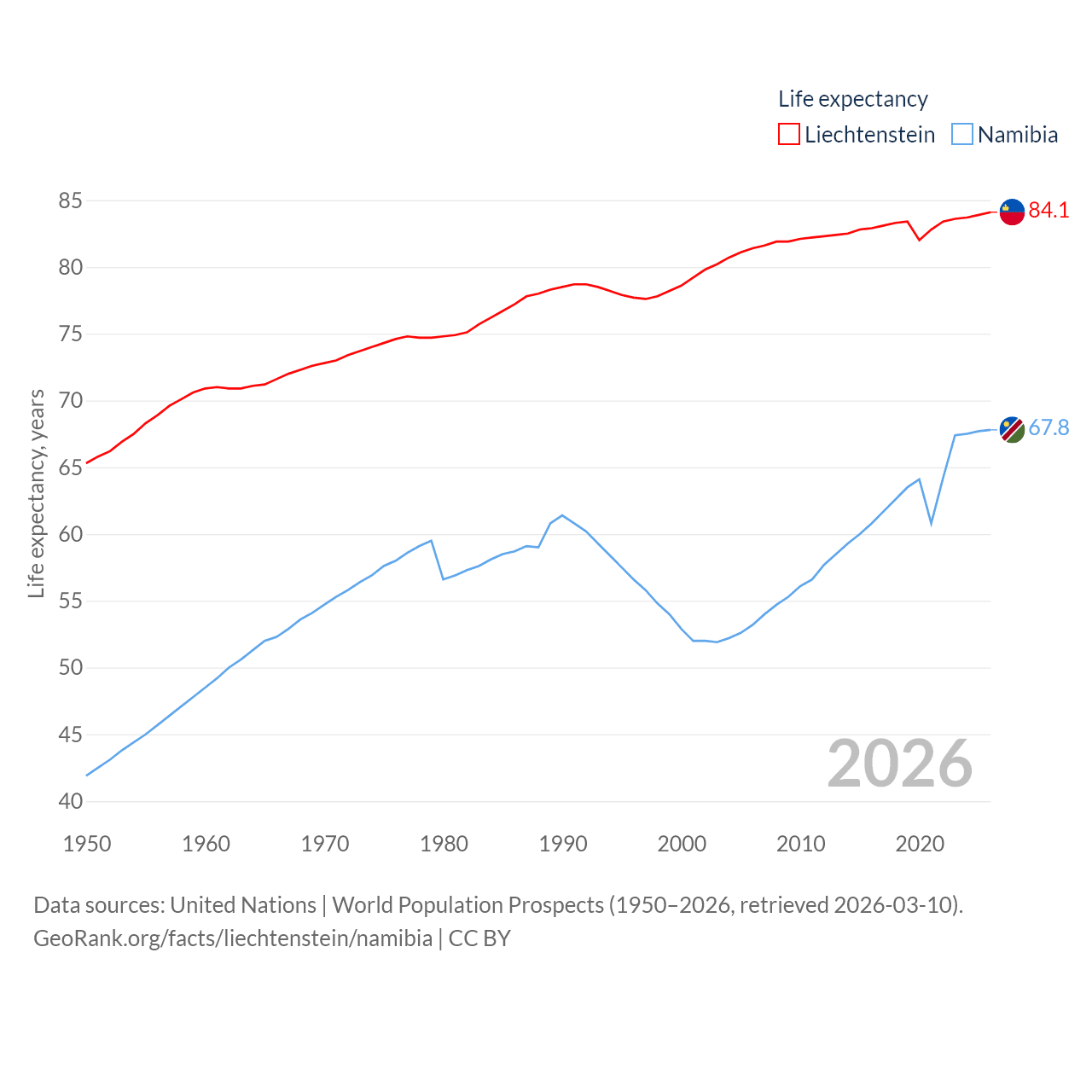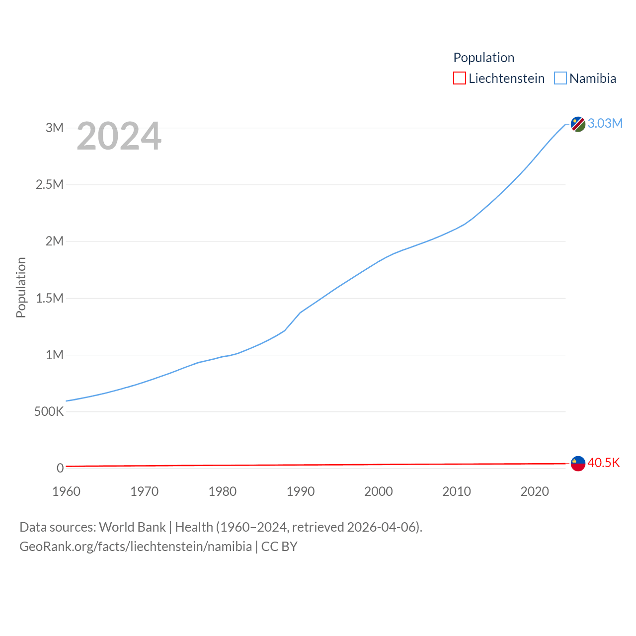 Liechtenstein has a population of 40.4K (ranked 190/197), compared with 3.03M in Namibia (ranked 136/197). Liechtenstein's land area is 61.8 sq mi versus 317,874 sq mi for Namibia (ranked 192nd vs. 33rd).