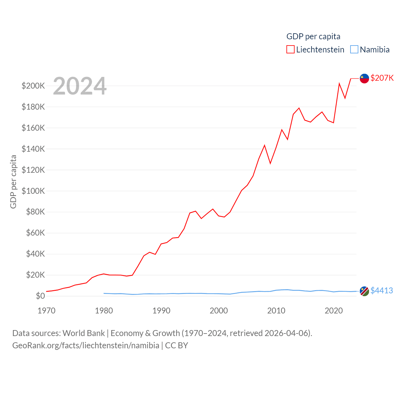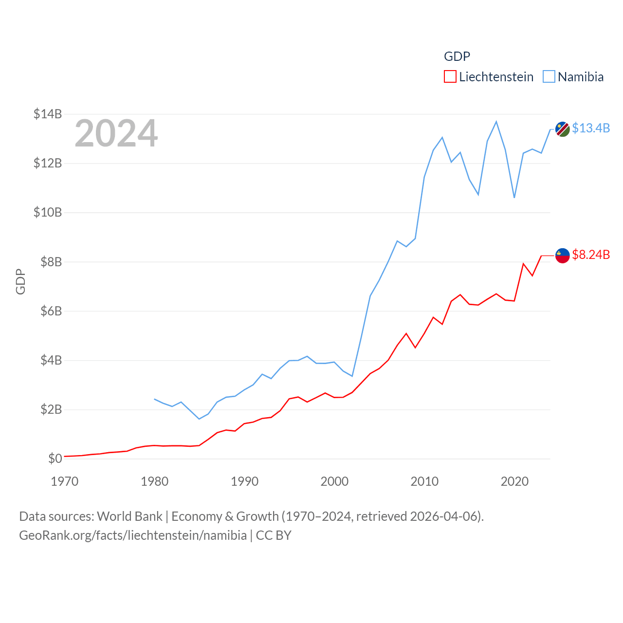 By GDP, Liechtenstein ranks 156/197 ($8.24B) and Namibia ranks 147/197 ($13.4B). By GDP per capita, Liechtenstein ranks 2/197 ($206,781), while Namibia ranks 126/197 ($4,413).