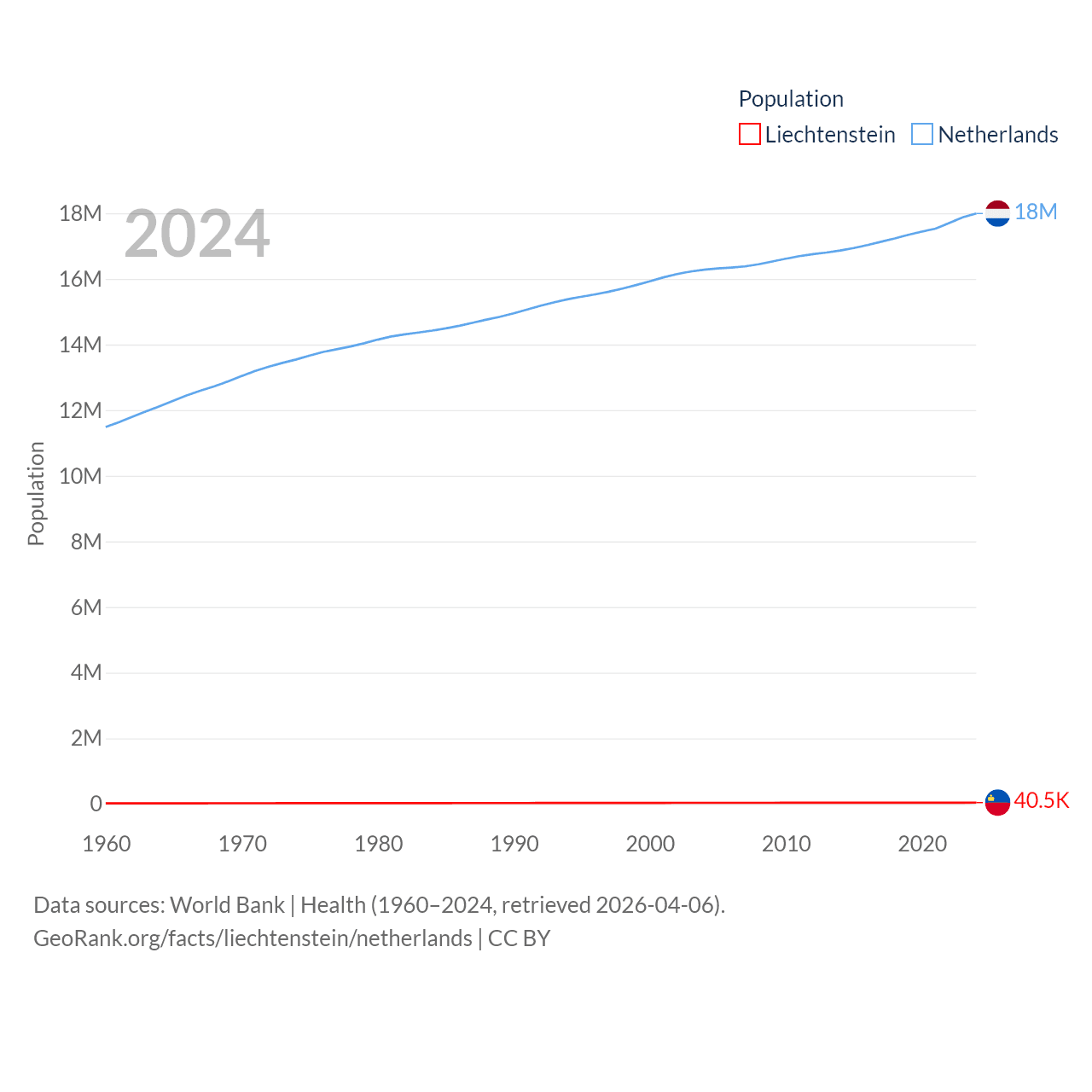 Liechtenstein has a population of 40.4K (ranked 190/197), compared with 18M in The Netherlands (ranked 72/197). Liechtenstein's land area is 61.8 sq mi versus 13,000 sq mi for The Netherlands (ranked 192nd vs. 134th).