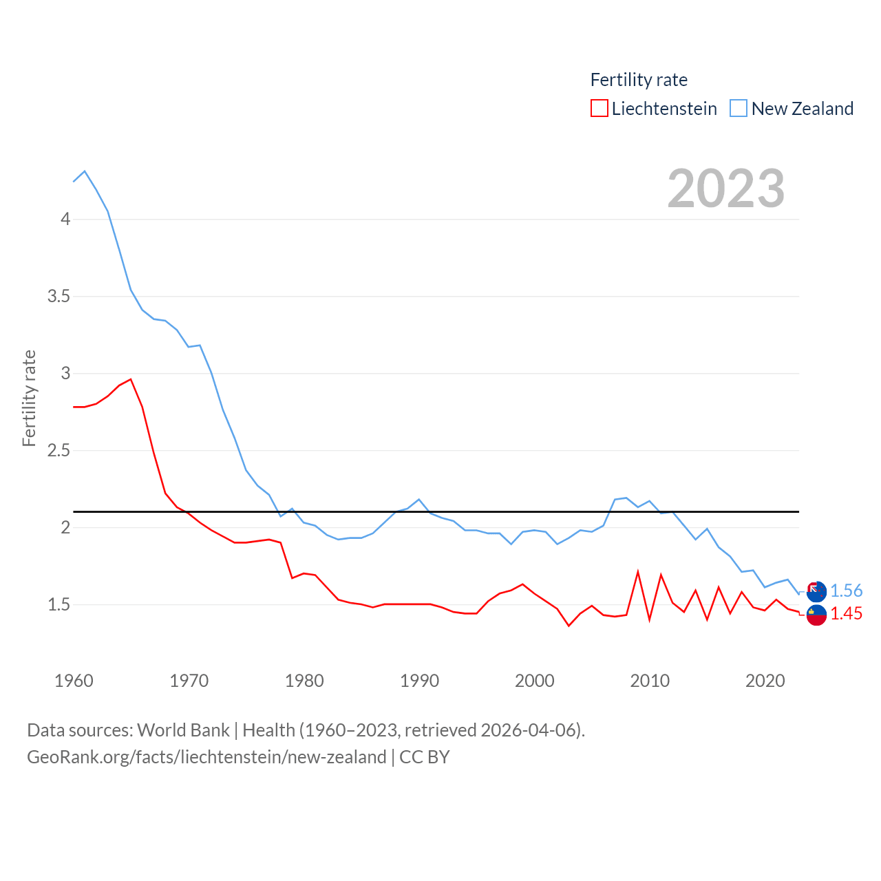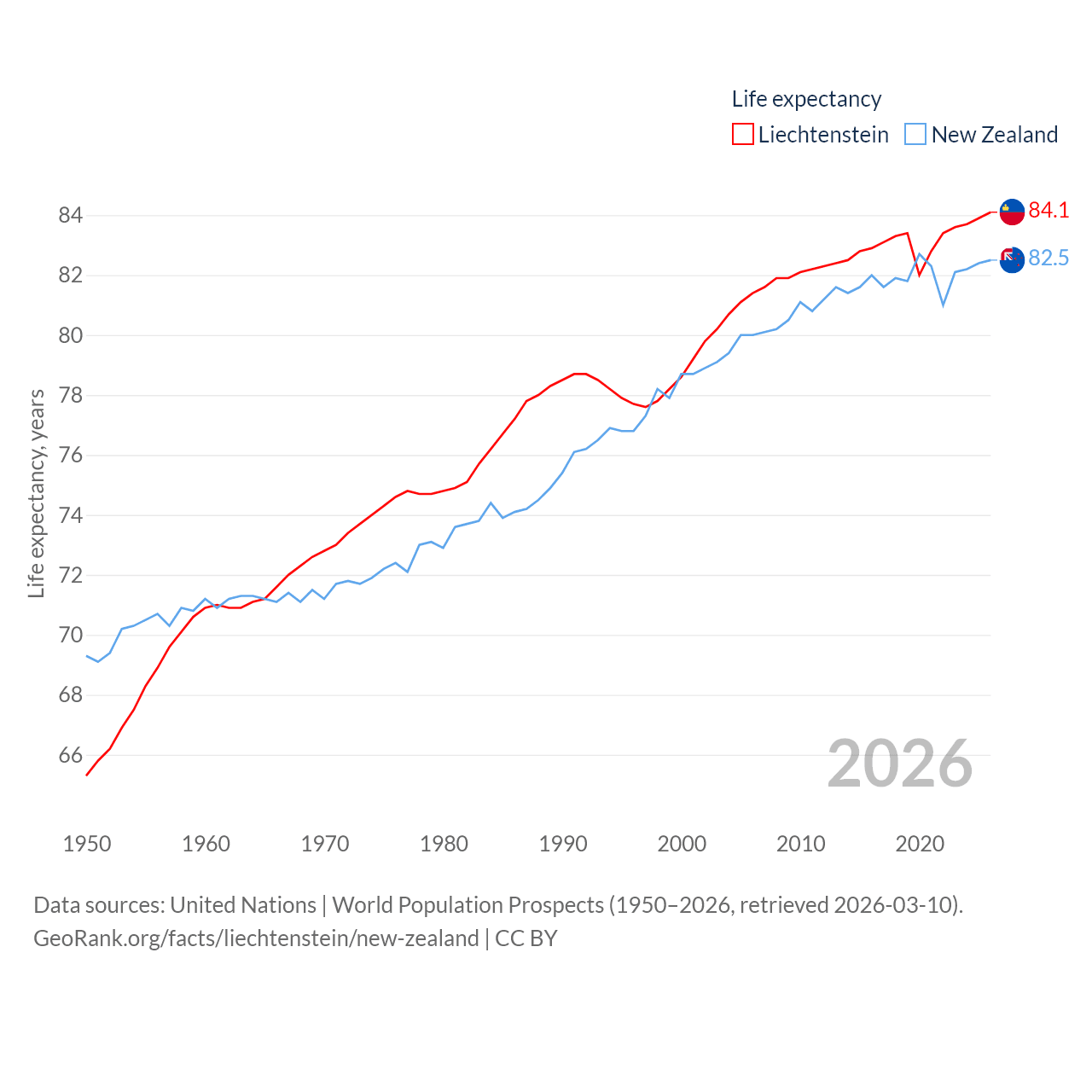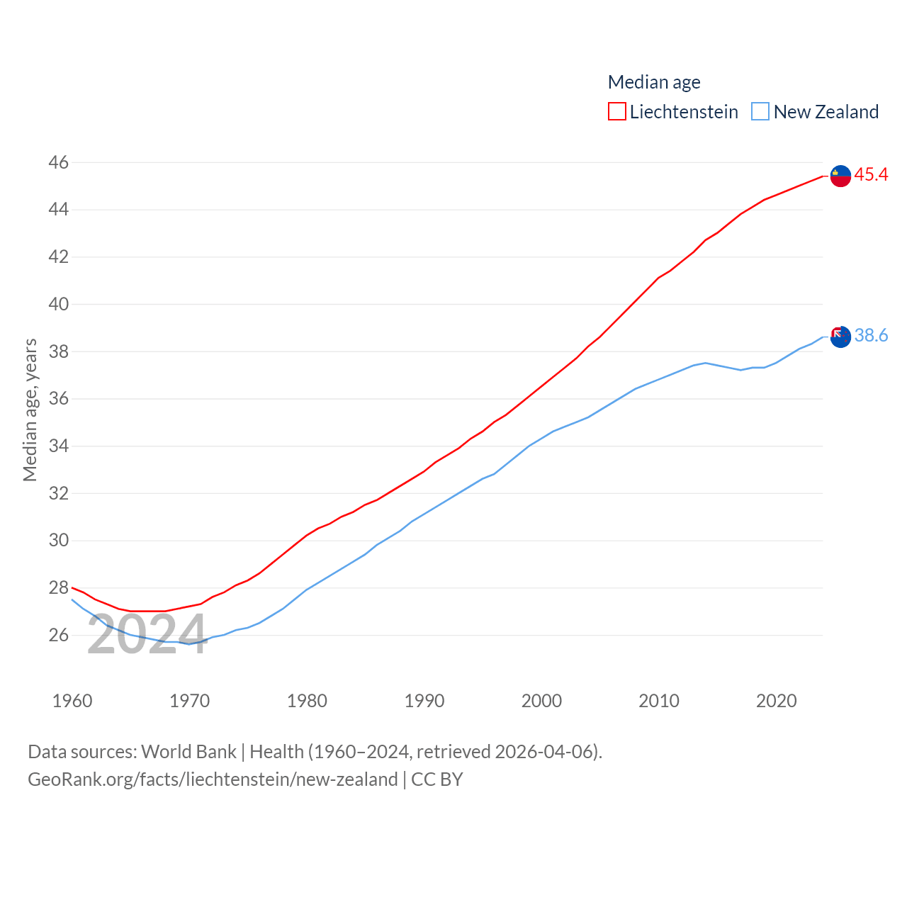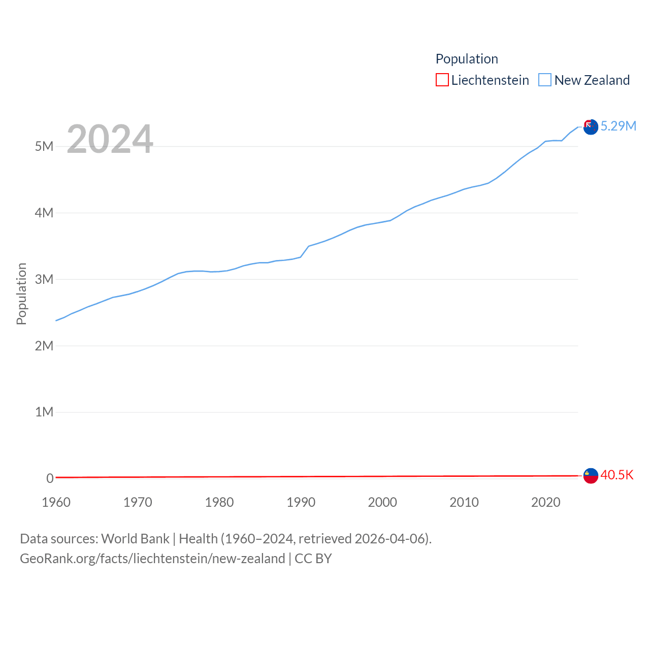 Liechtenstein has a population of 40.4K (ranked 190/197), compared with 5.29M in New Zealand (ranked 123/197). Liechtenstein's land area is 61.8 sq mi versus 101,665 sq mi for New Zealand (ranked 192nd vs. 74th).