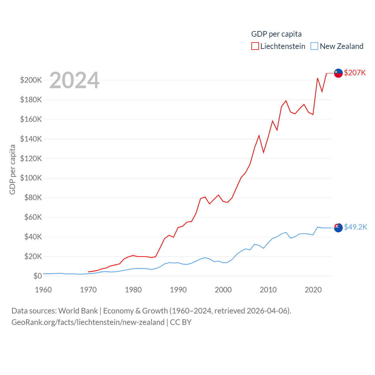 By GDP, Liechtenstein ranks 156/197 ($8.24B) and New Zealand ranks 52/197 ($260B). By GDP per capita, Liechtenstein ranks 2/197 ($206,781), while New Zealand ranks 26/197 ($49,205).