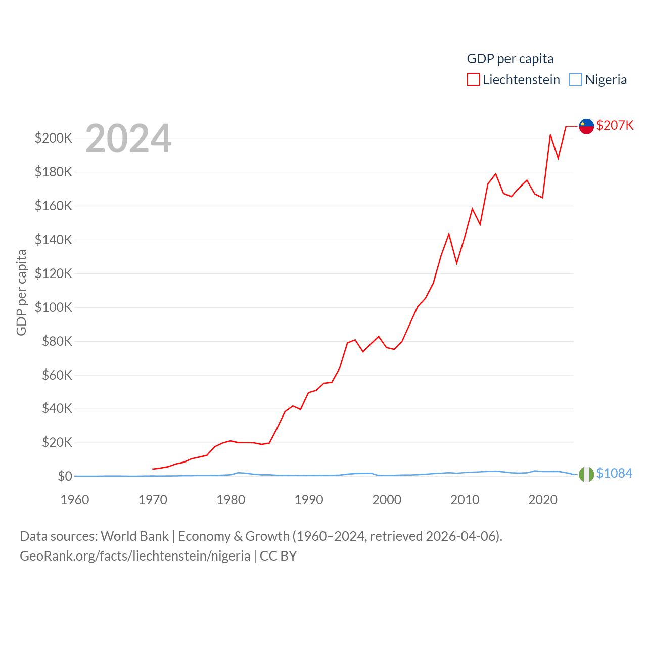 By GDP, Liechtenstein ranks 156/197 ($8.24B) and Nigeria ranks 54/197 ($252B). By GDP per capita, Liechtenstein ranks 2/197 ($206,781), while Nigeria ranks 174/197 ($1,084).