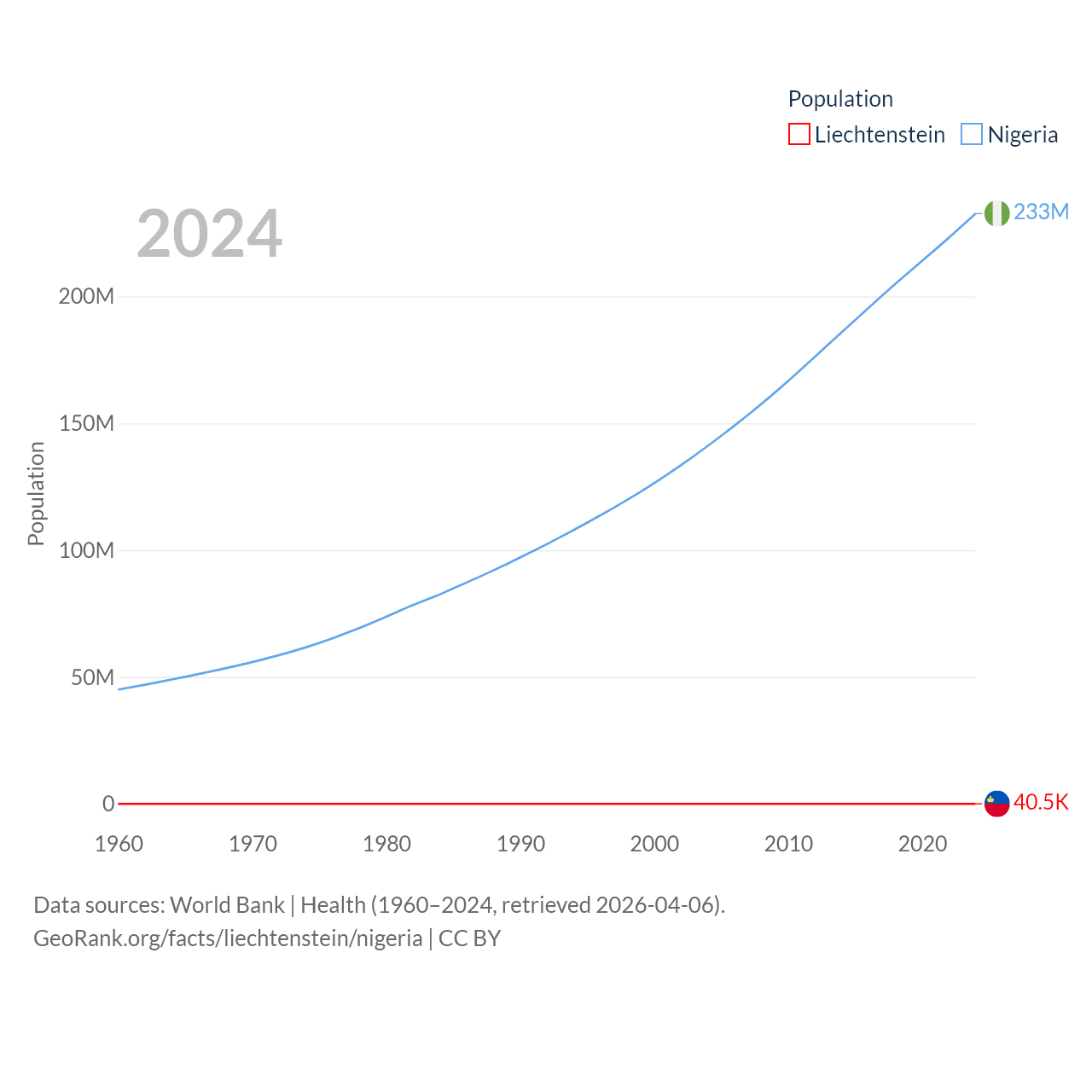 Liechtenstein has a population of 40.4K (ranked 190/197), compared with 233M in Nigeria (ranked 6/197). Liechtenstein's land area is 61.8 sq mi versus 351,650 sq mi for Nigeria (ranked 192nd vs. 30th).