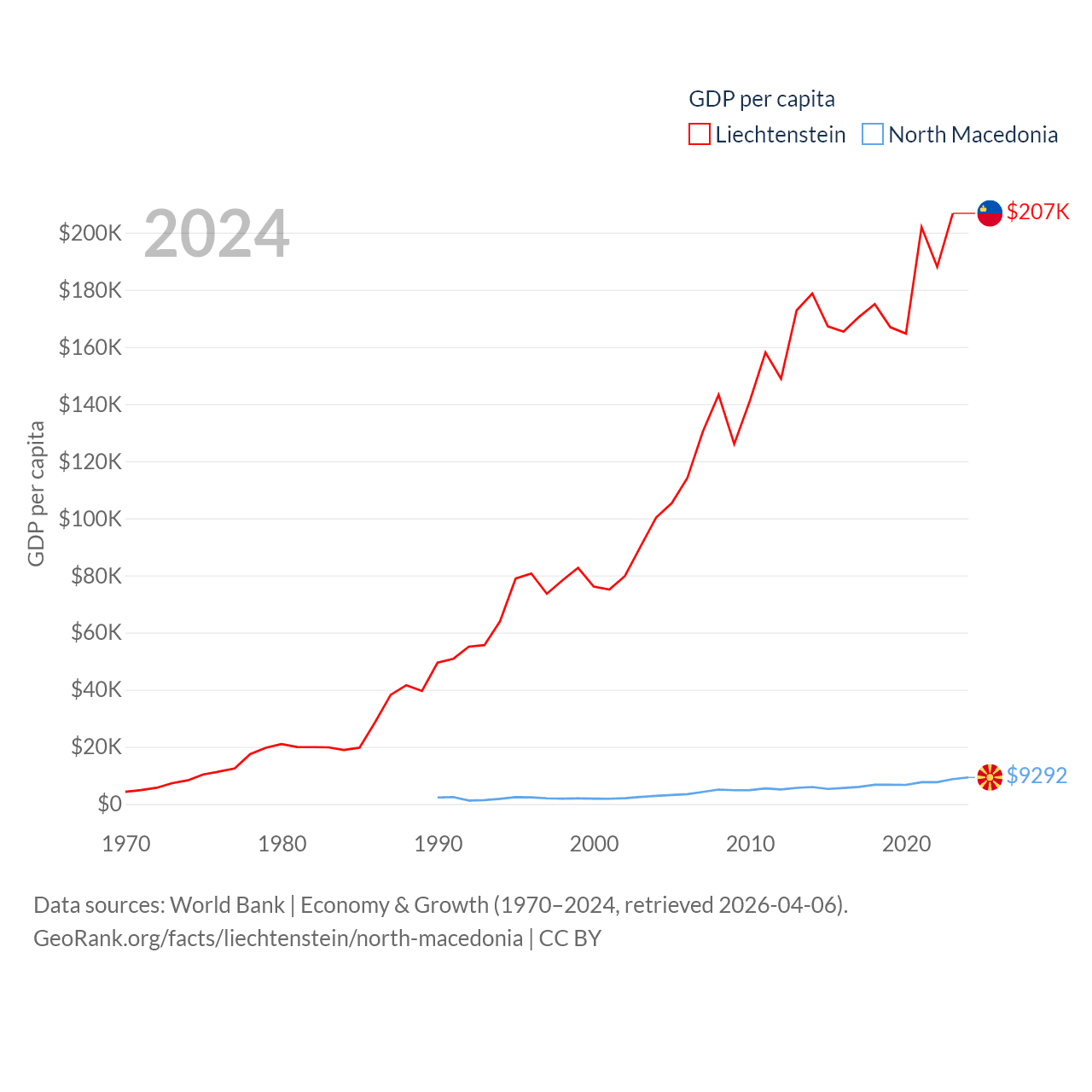By GDP, Liechtenstein ranks 156/197 ($8.24B) and North Macedonia ranks 138/197 ($17B). By GDP per capita, Liechtenstein ranks 2/197 ($206,781), while North Macedonia ranks 88/197 ($9,292).