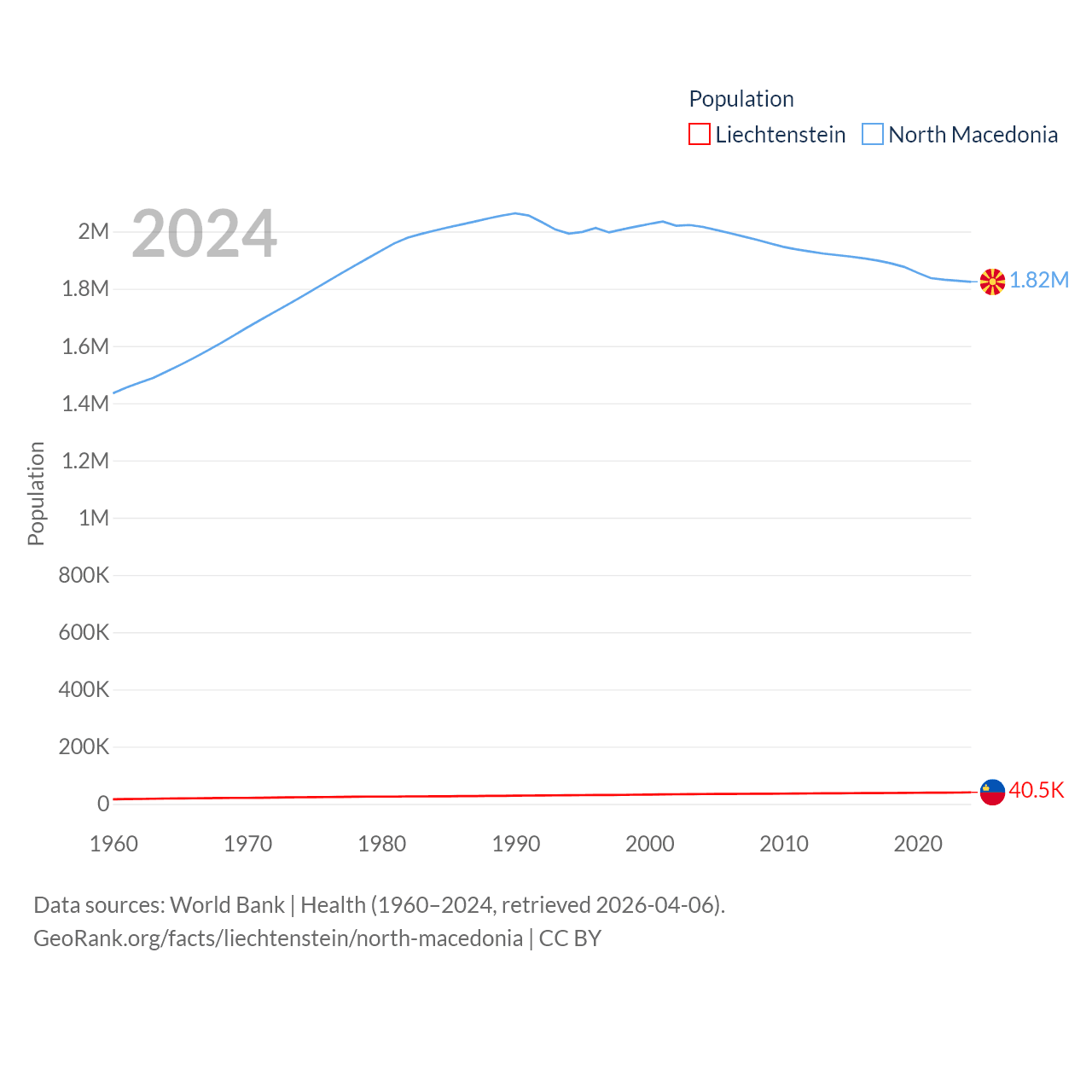 Liechtenstein has a population of 40.4K (ranked 190/197), compared with 1.82M in North Macedonia (ranked 150/197). Liechtenstein's land area is 61.8 sq mi versus 9,737 sq mi for North Macedonia (ranked 192nd vs. 145th).