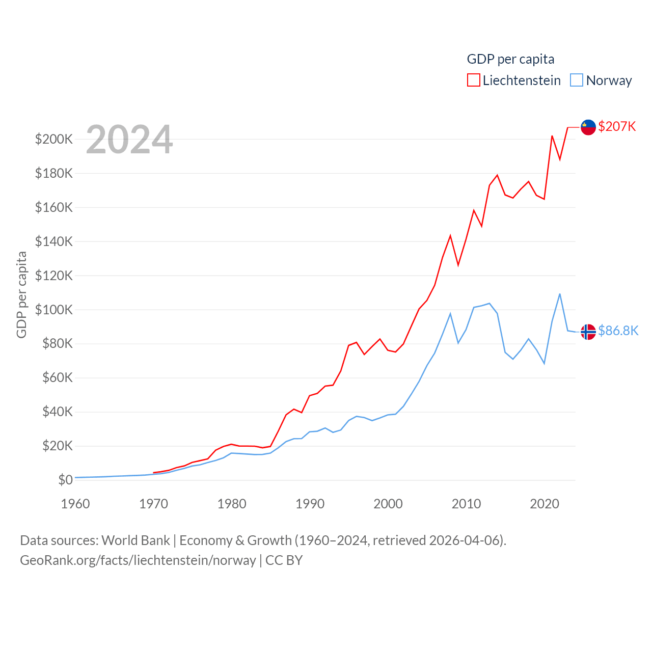 By GDP, Liechtenstein ranks 156/197 ($8.24B) and Norway ranks 32/197 ($484B). By GDP per capita, Liechtenstein ranks 2/197 ($206,781), while Norway ranks 8/197 ($86,785).
