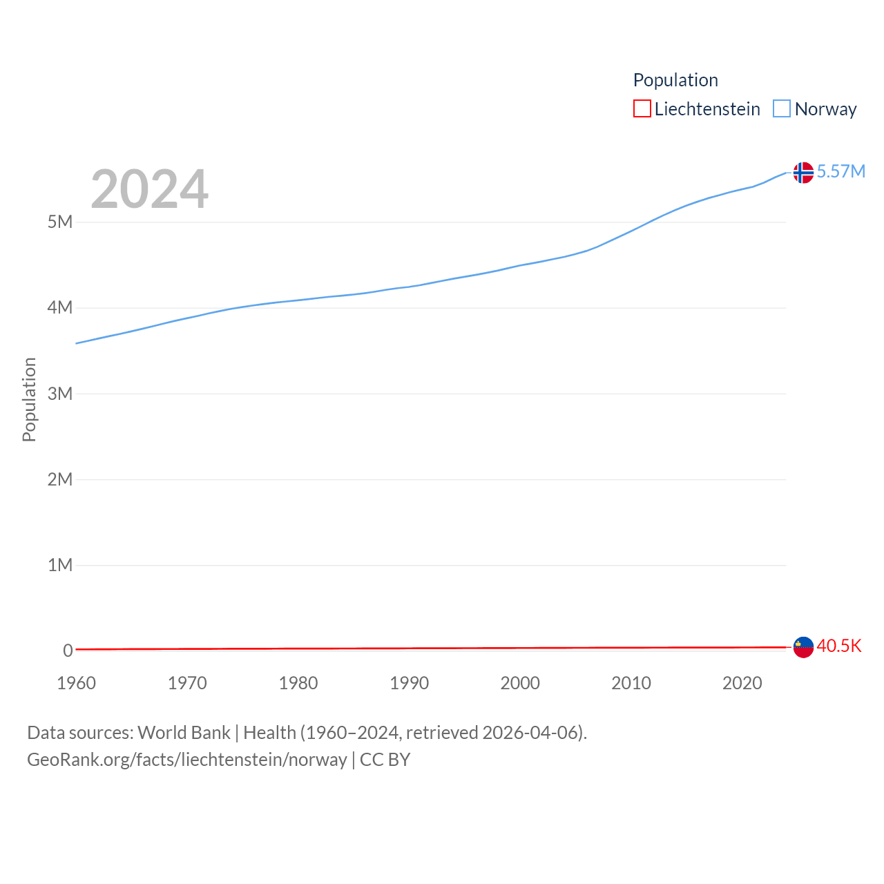Liechtenstein has a population of 40.4K (ranked 190/197), compared with 5.57M in Norway (ranked 118/197). Liechtenstein's land area is 61.8 sq mi versus 140,645 sq mi for Norway (ranked 192nd vs. 62nd).
