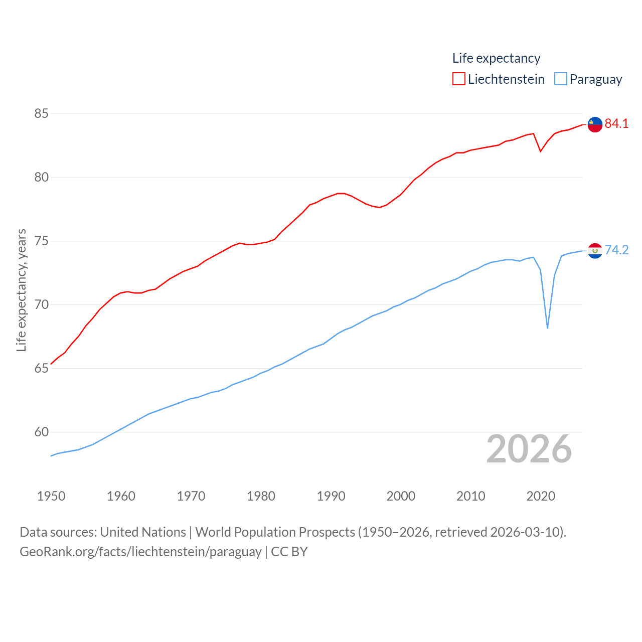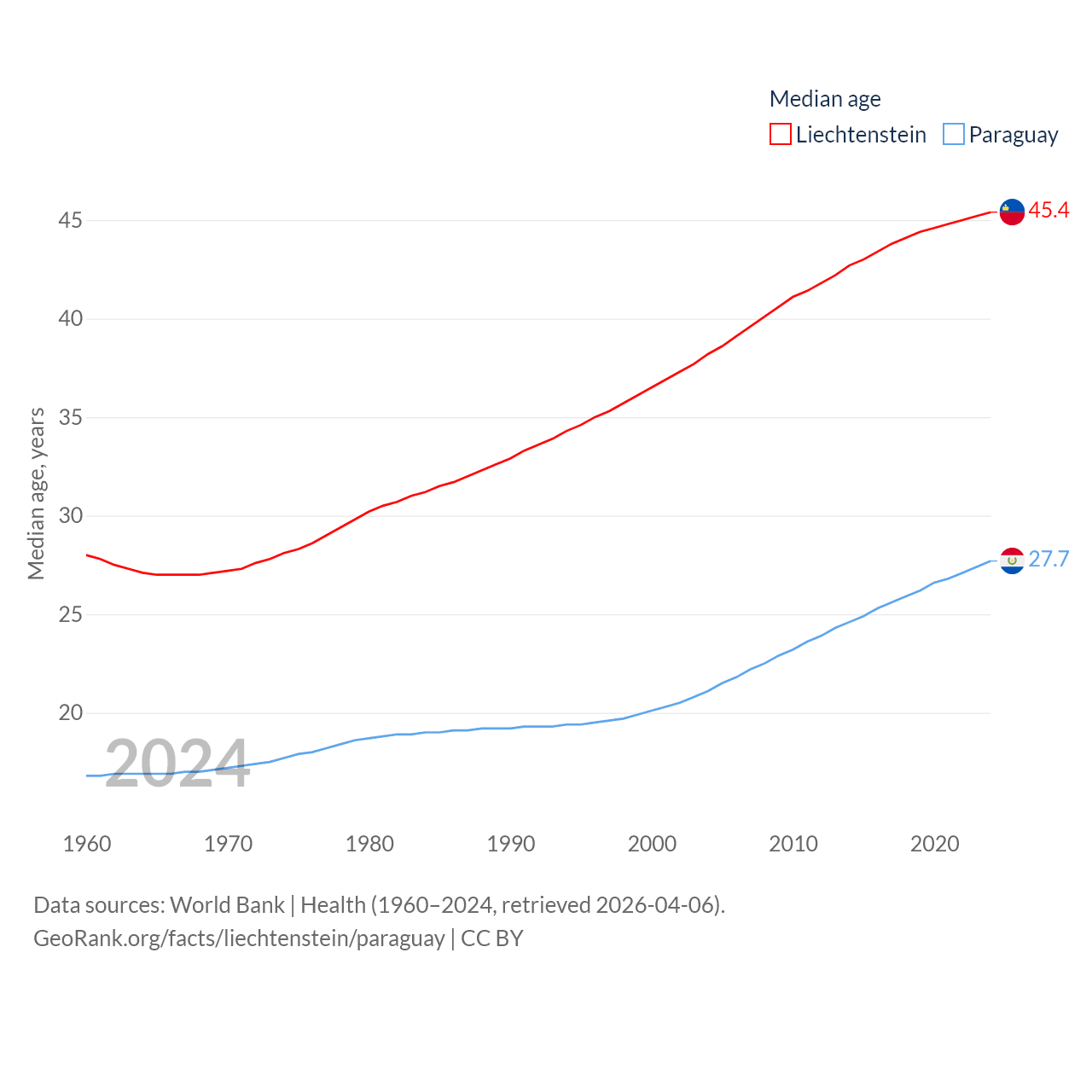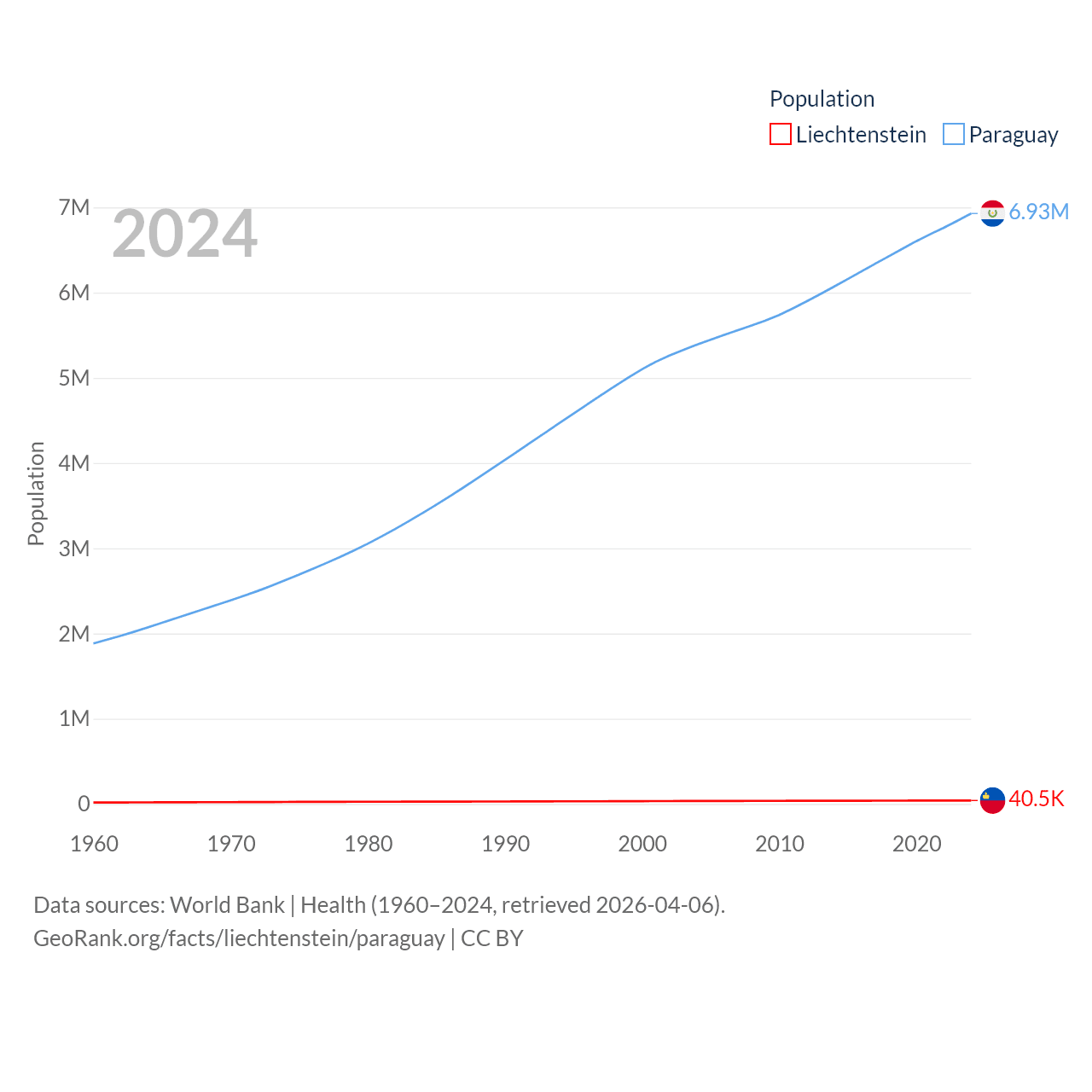 Liechtenstein has a population of 40.4K (ranked 190/197), compared with 6.93M in Paraguay (ranked 107/197). Liechtenstein's land area is 61.8 sq mi versus 152,901 sq mi for Paraguay (ranked 192nd vs. 59th).