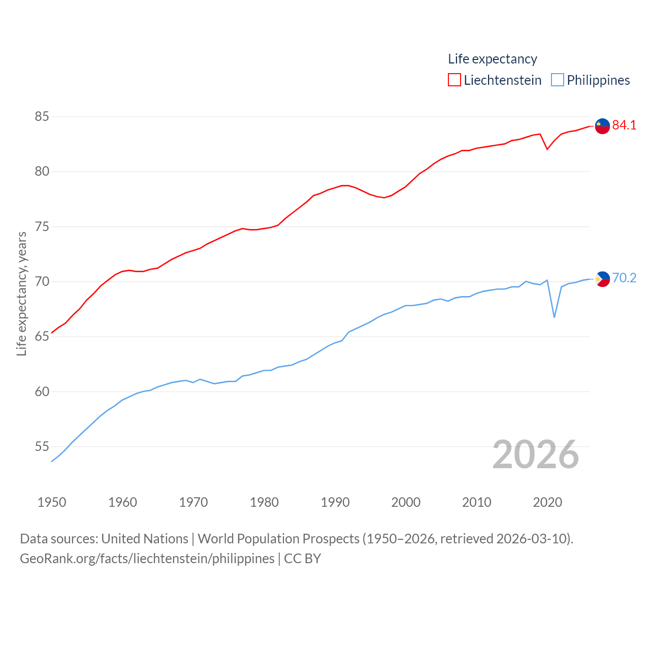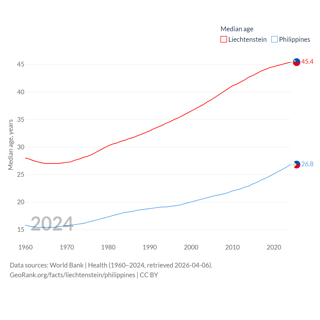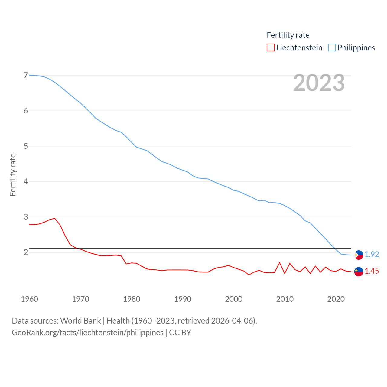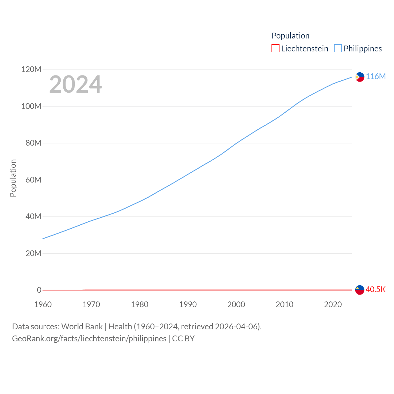 Liechtenstein has a population of 40.4K (ranked 190/197), compared with 116M in The Philippines (ranked 14/197). Liechtenstein's land area is 61.8 sq mi versus 115,124 sq mi for The Philippines (ranked 192nd vs. 71st).