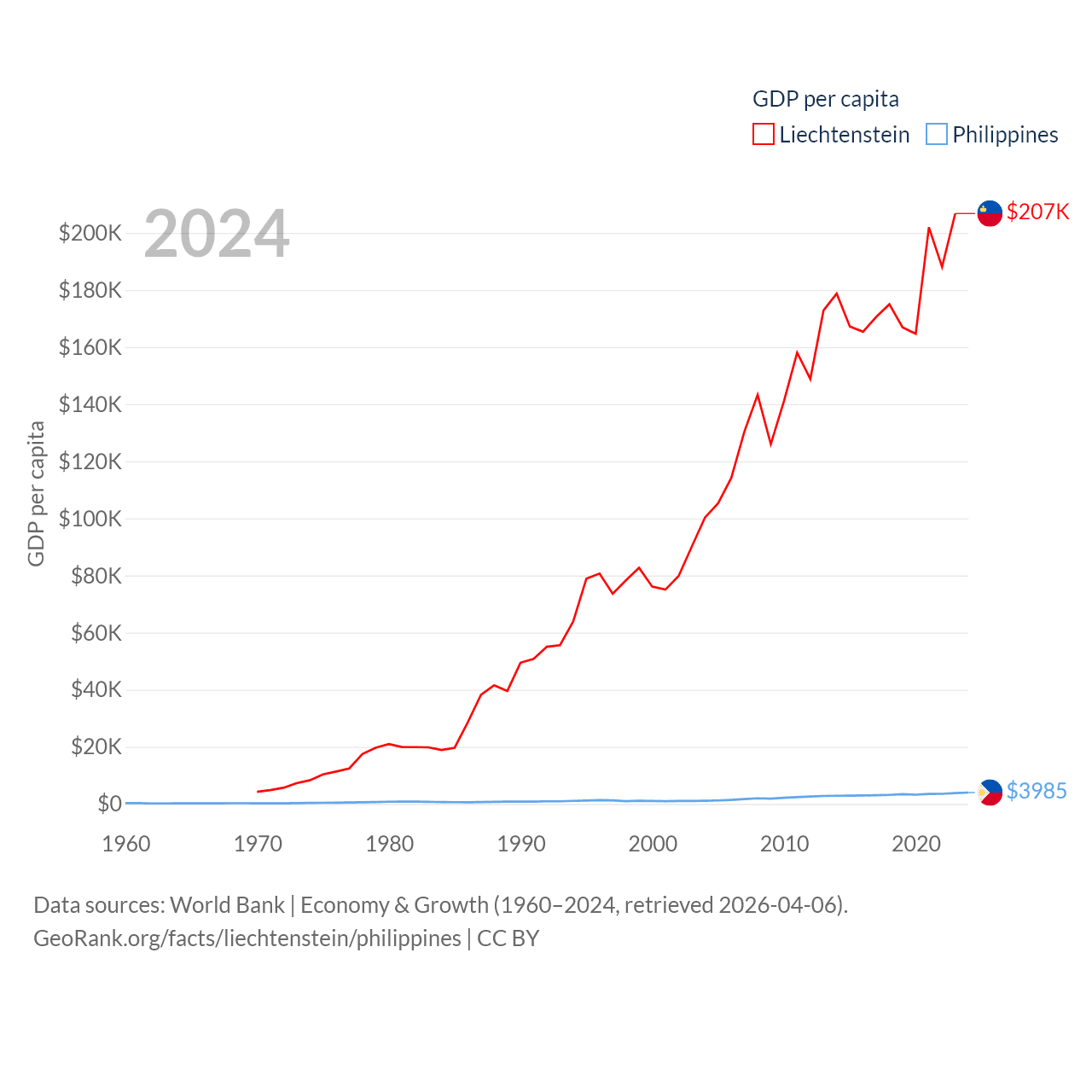 By GDP, Liechtenstein ranks 156/197 ($8.24B) and The Philippines ranks 35/197 ($462B). By GDP per capita, Liechtenstein ranks 2/197 ($206,781), while The Philippines ranks 130/197 ($3,985).
