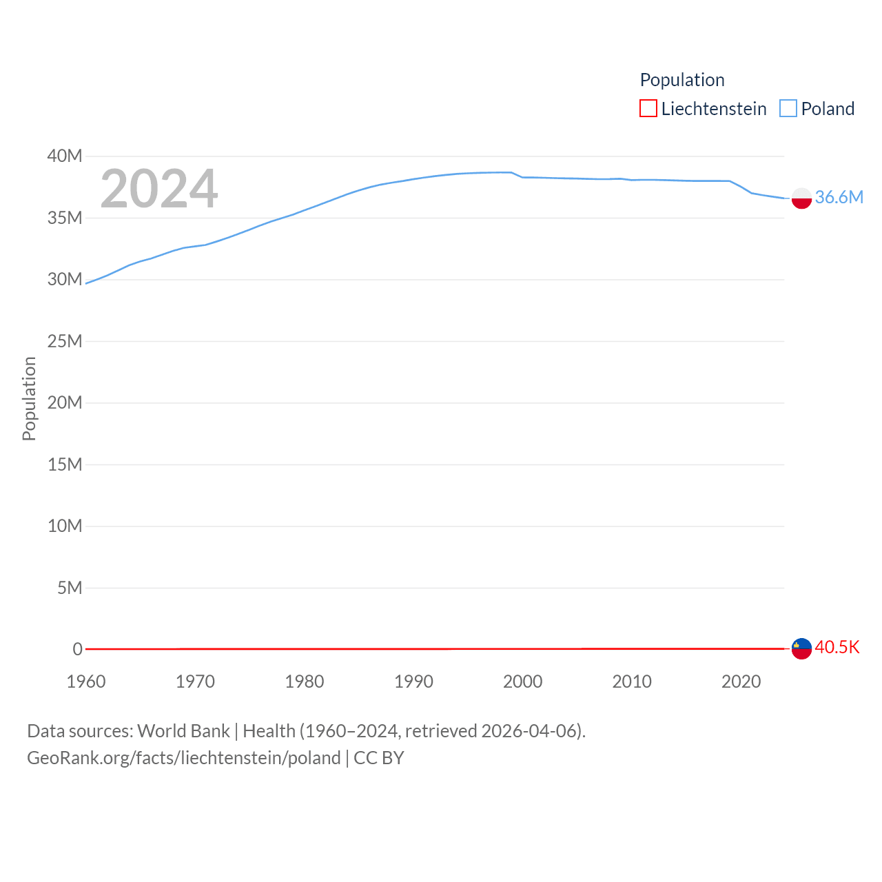 Liechtenstein has a population of 40.4K (ranked 190/197), compared with 36.6M in Poland (ranked 42/197). Liechtenstein's land area is 61.8 sq mi versus 118,252 sq mi for Poland (ranked 192nd vs. 69th).