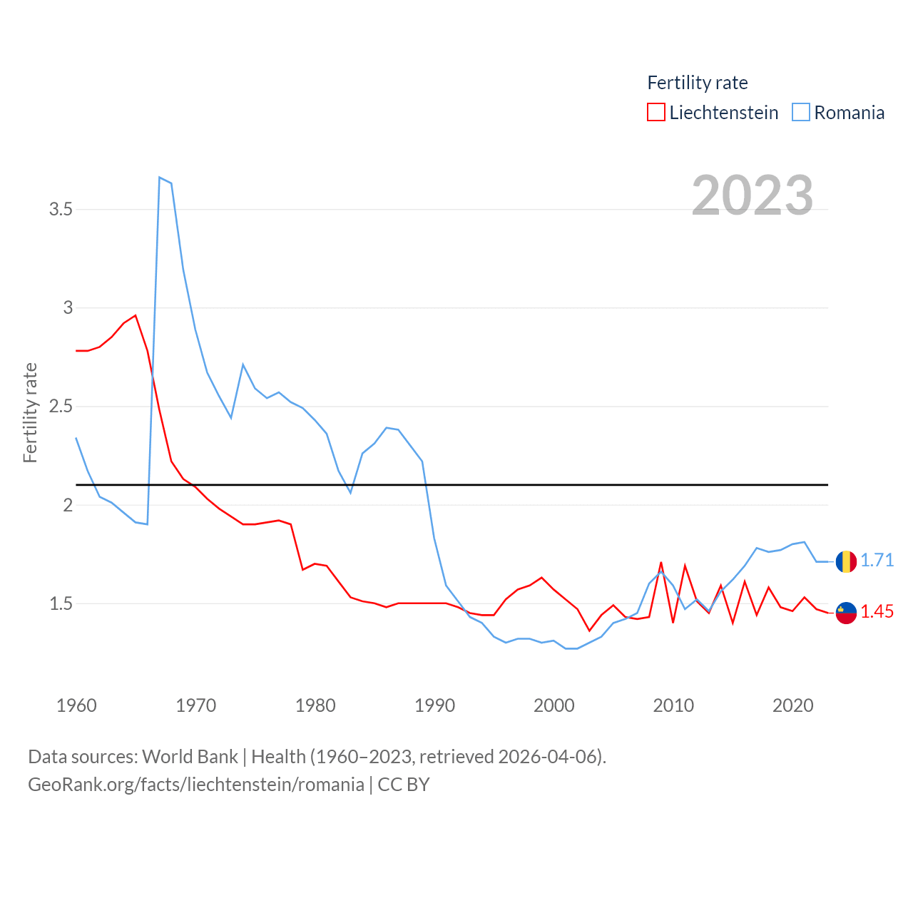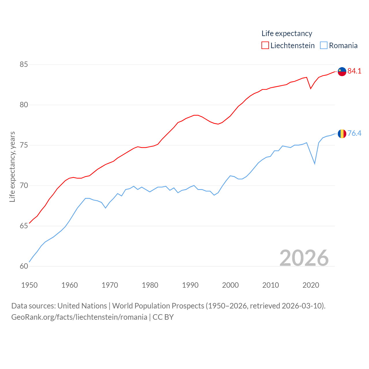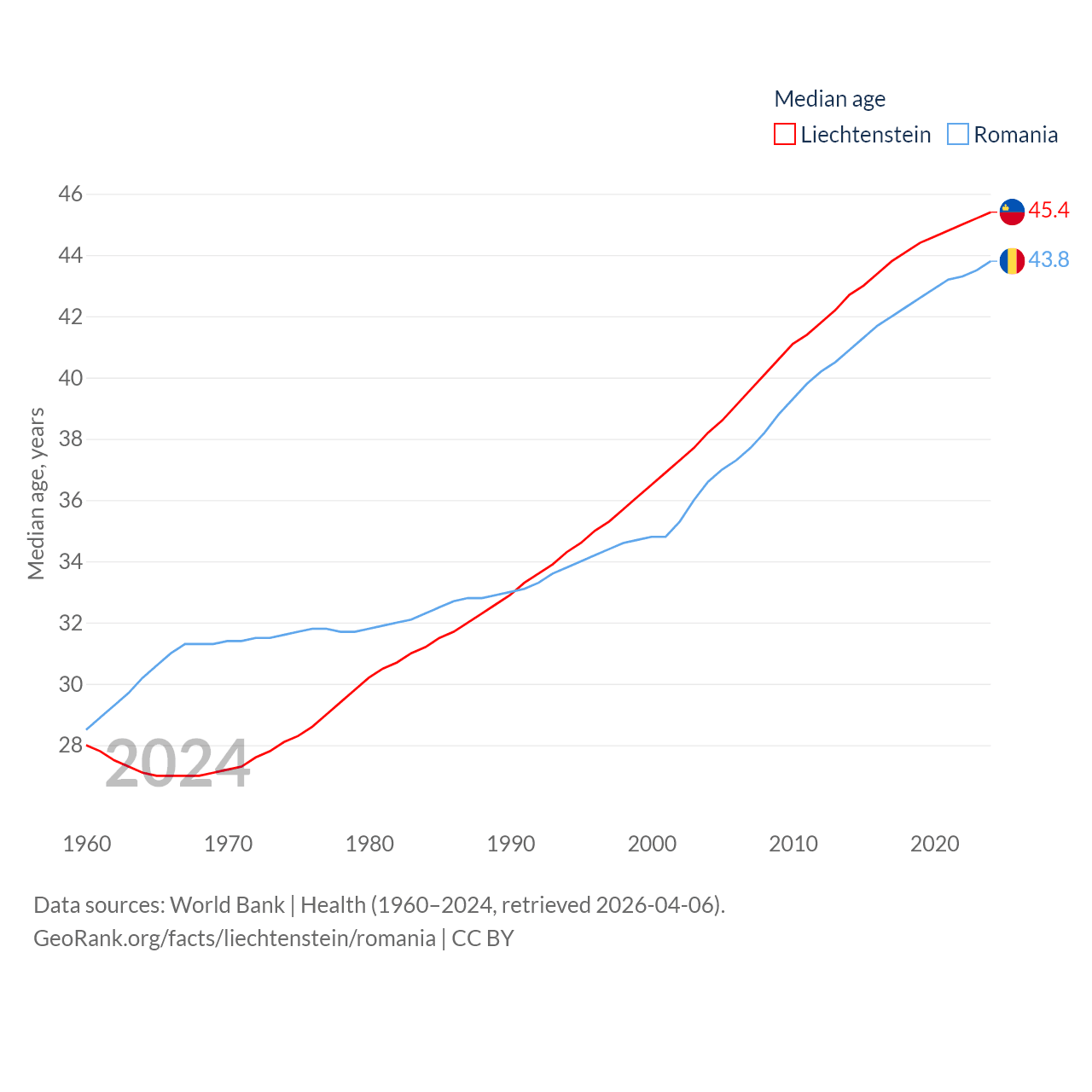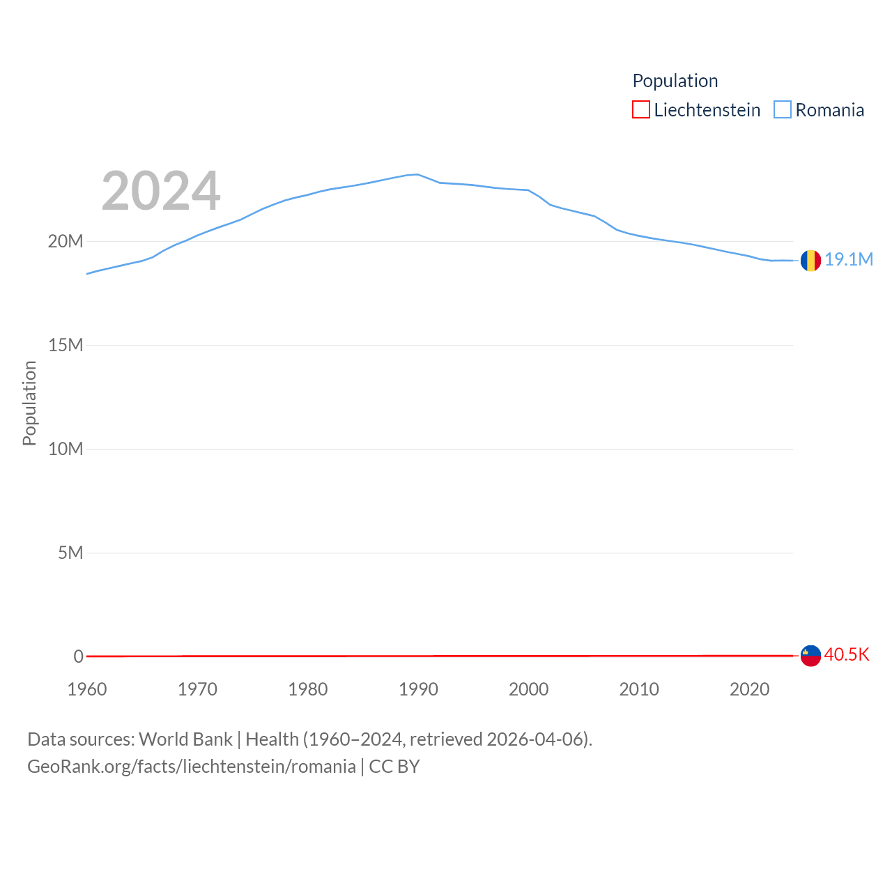 Liechtenstein has a population of 40.4K (ranked 190/197), compared with 19.1M in Romania (ranked 67/197). Liechtenstein's land area is 61.8 sq mi versus 88,834 sq mi for Romania (ranked 192nd vs. 80th).