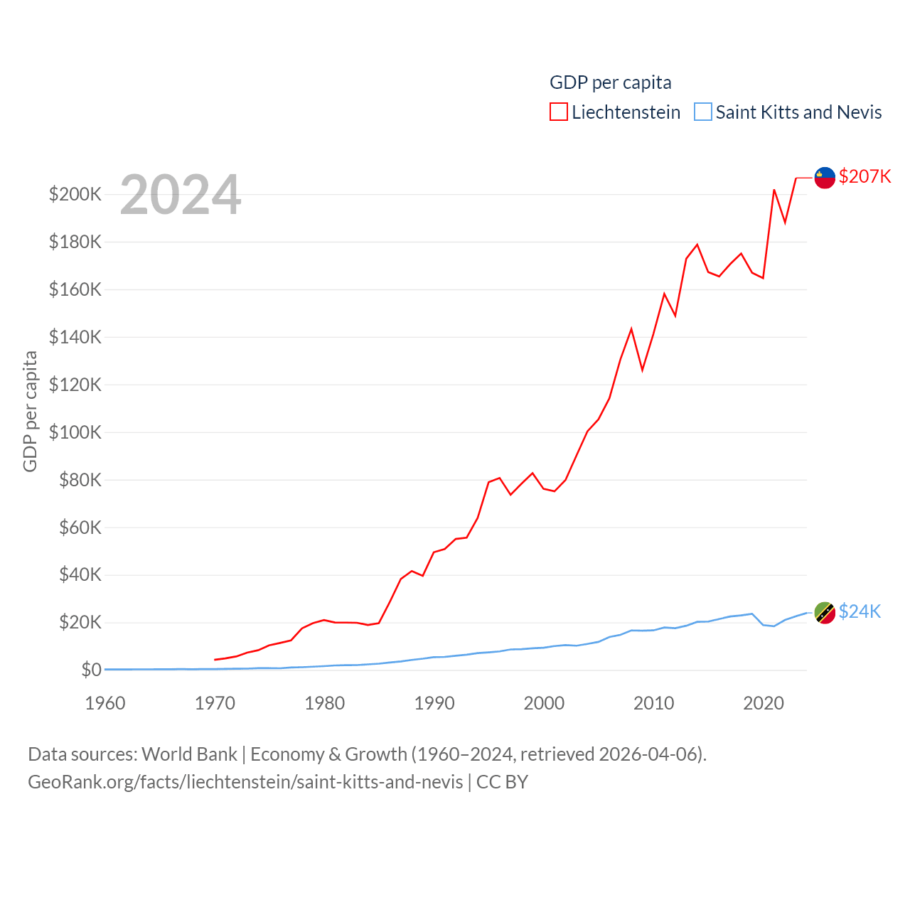 By GDP, Liechtenstein ranks 156/197 ($8.24B) and Saint Kitts and Nevis ranks 187/197 ($1.12B). By GDP per capita, Liechtenstein ranks 2/197 ($206,781), while Saint Kitts and Nevis ranks 51/197 ($23,961).