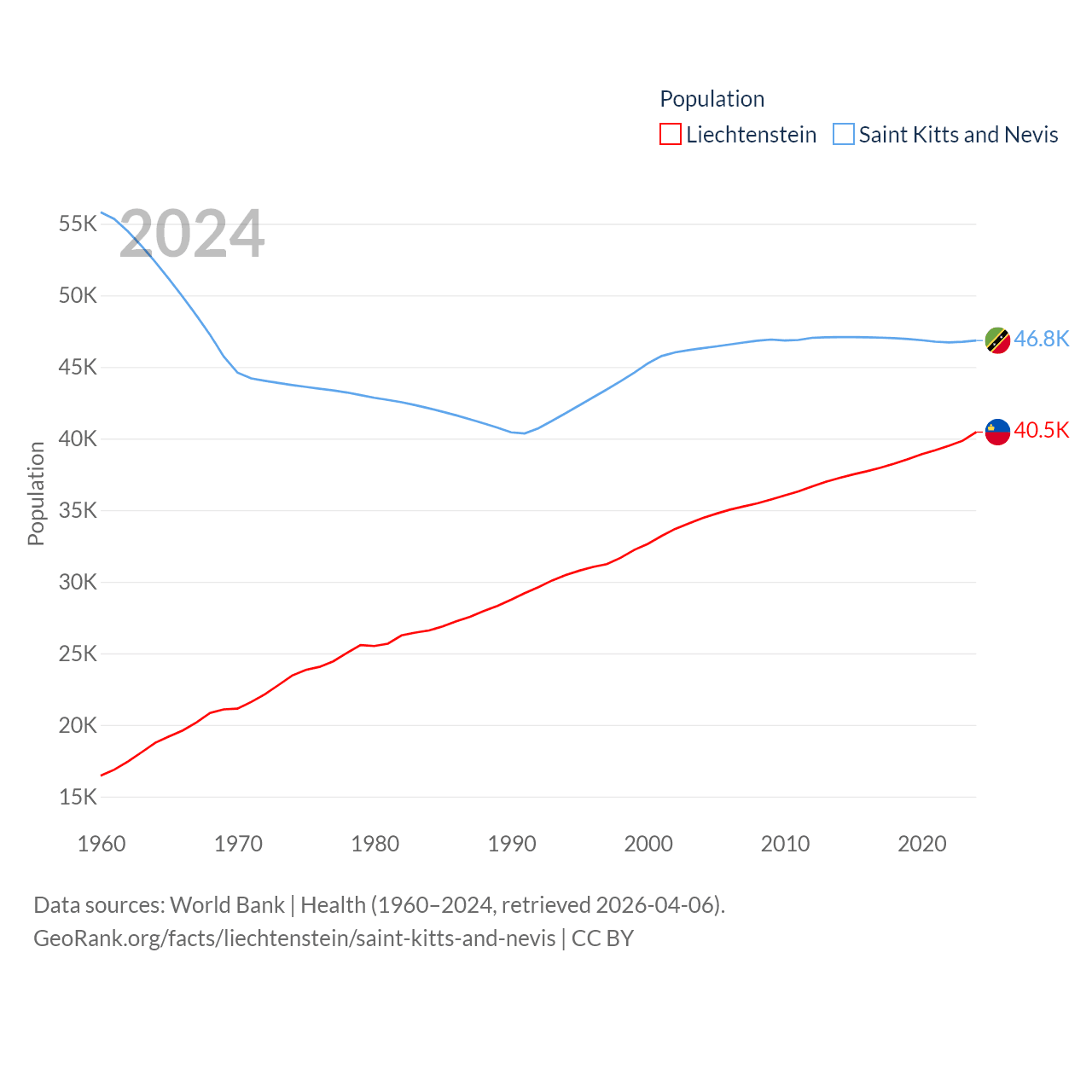 Liechtenstein has a population of 40.4K (ranked 190/197), compared with 46.8K in Saint Kitts and Nevis (ranked 189/197). Liechtenstein's land area is 61.8 sq mi versus 100.4 sq mi for Saint Kitts and Nevis (ranked 192nd vs. 189th).