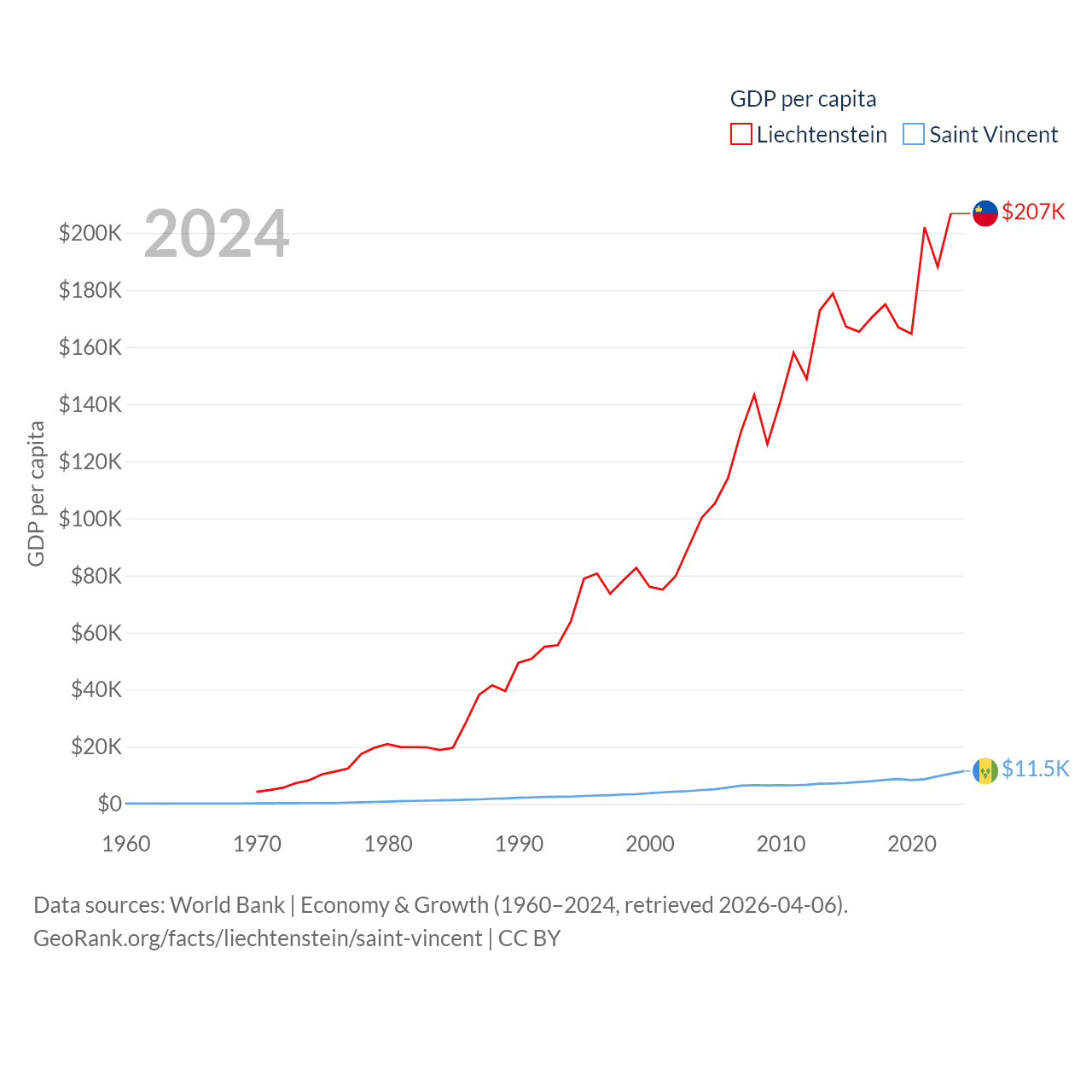 By GDP, Liechtenstein ranks 156/197 ($8.24B) and Saint Vincent ranks 186/197 ($1.16B). By GDP per capita, Liechtenstein ranks 2/197 ($206,781), while Saint Vincent ranks 81/197 ($11,501).