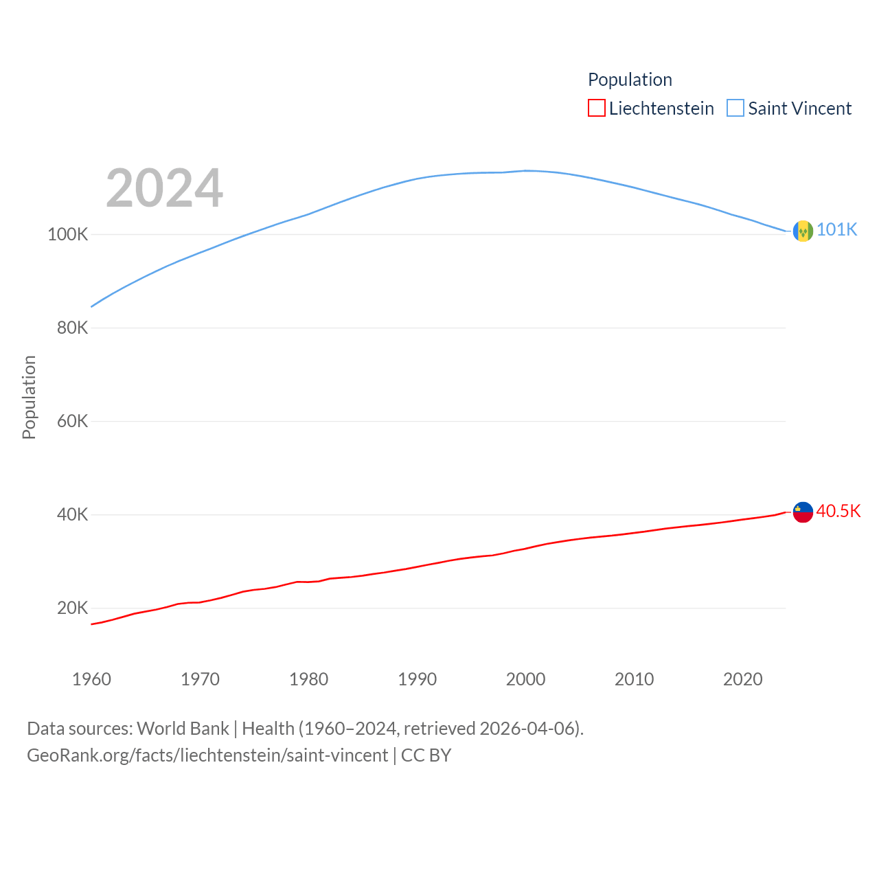 Liechtenstein has a population of 40.4K (ranked 190/197), compared with 101K in Saint Vincent (ranked 184/197). Liechtenstein's land area is 61.8 sq mi versus 150.6 sq mi for Saint Vincent (ranked 192nd vs. 185th).
