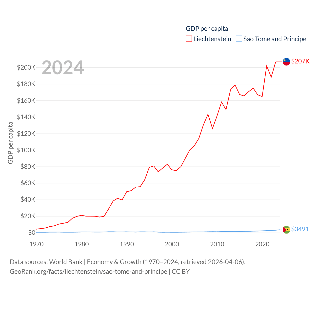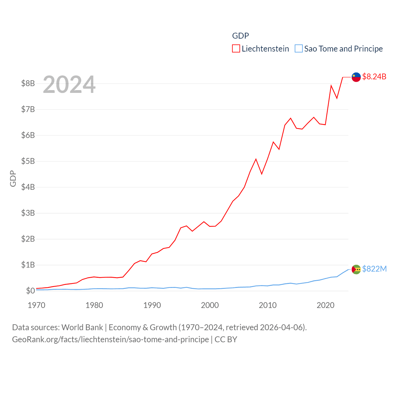 By GDP, Liechtenstein ranks 156/197 ($8.24B) and Sao Tome and Principe ranks 189/197 ($822M). By GDP per capita, Liechtenstein ranks 2/197 ($206,781), while Sao Tome and Principe ranks 134/197 ($3,491).