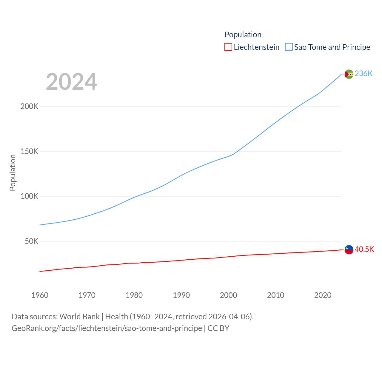 Liechtenstein has a population of 40.4K (ranked 190/197), compared with 236K in Sao Tome and Principe (ranked 176/197). Liechtenstein's land area is 61.8 sq mi versus 371 sq mi for Sao Tome and Principe (ranked 192nd vs. 172nd).