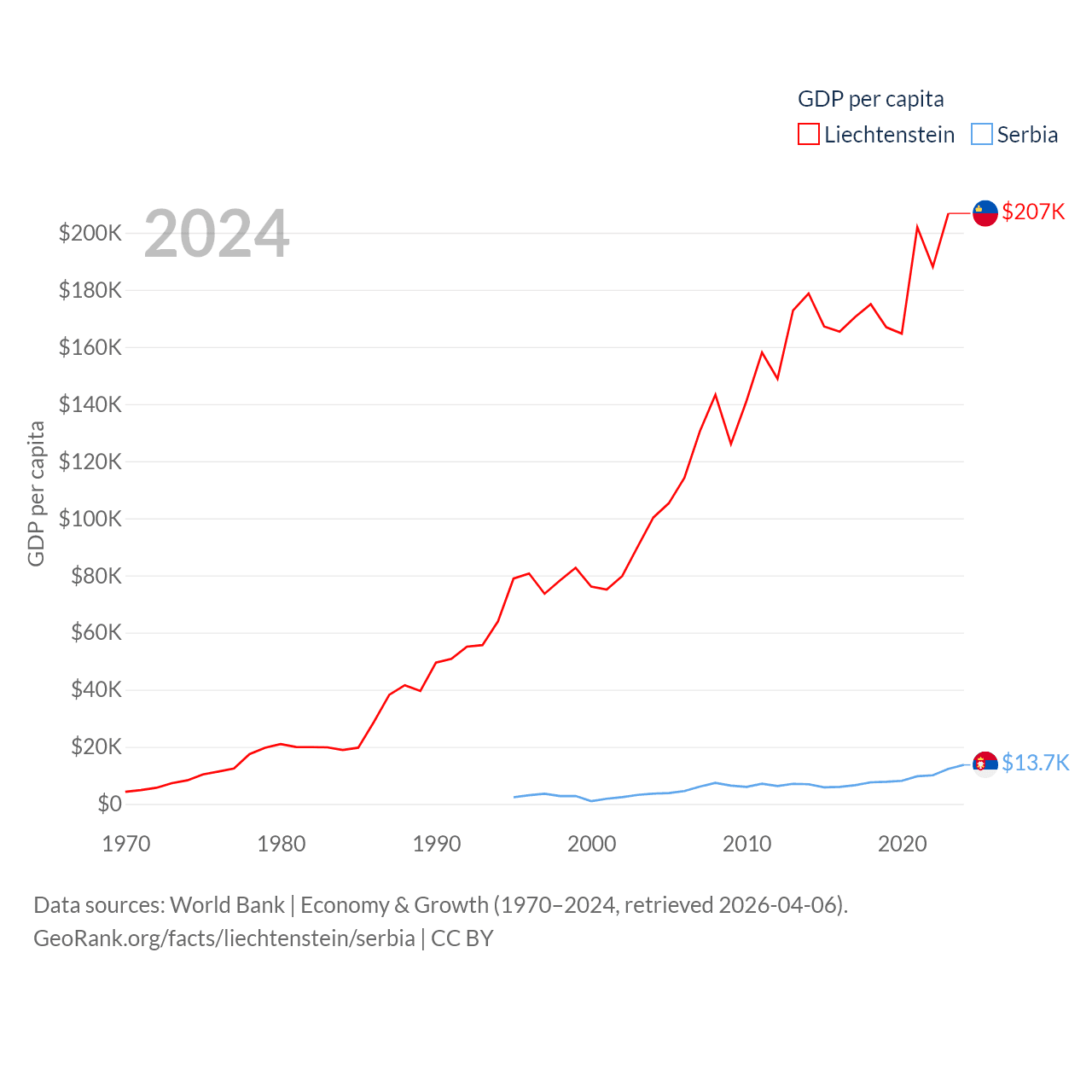 By GDP, Liechtenstein ranks 156/197 ($8.24B) and Serbia ranks 76/197 ($90.1B). By GDP per capita, Liechtenstein ranks 2/197 ($206,781), while Serbia ranks 73/197 ($13,679).