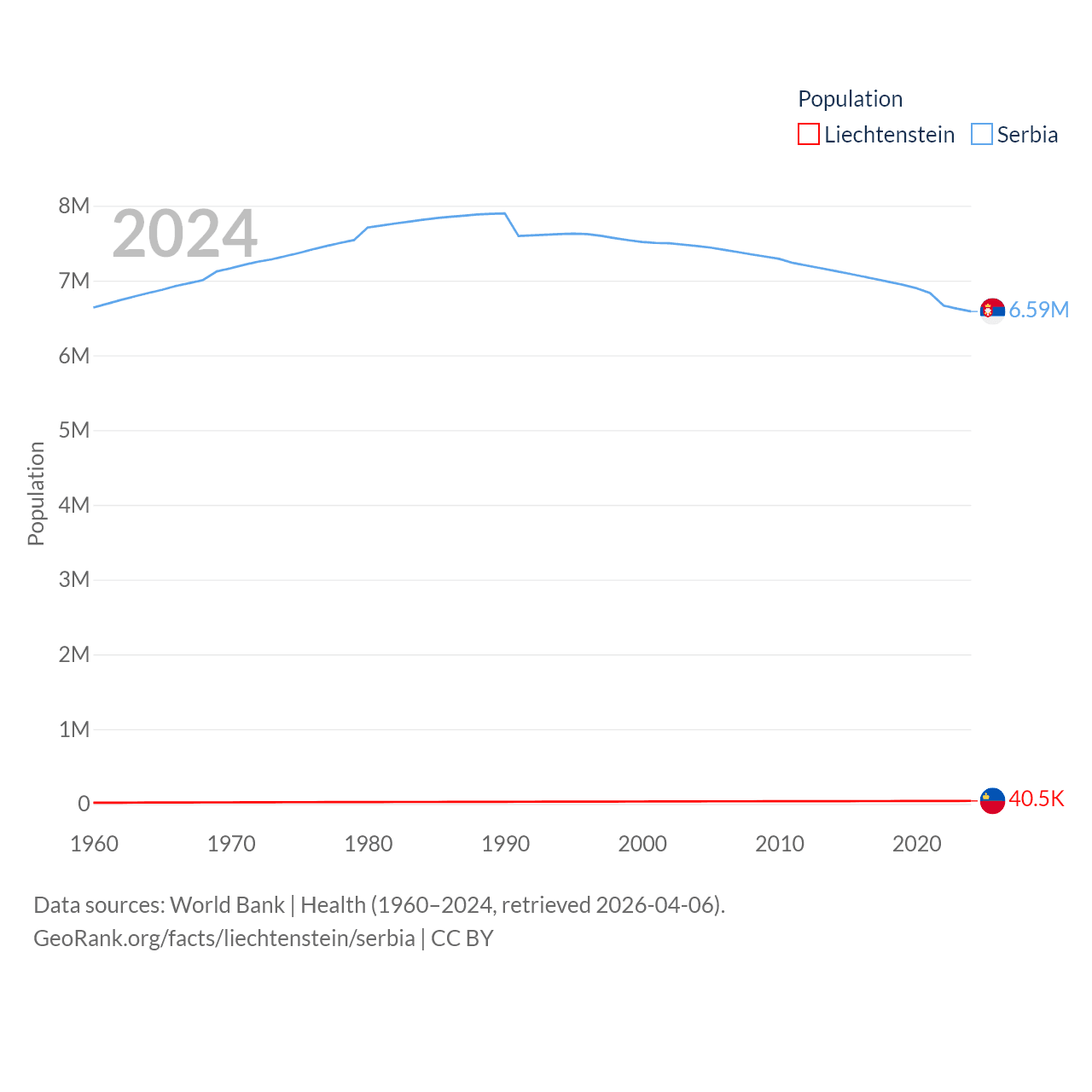Liechtenstein has a population of 40.4K (ranked 190/197), compared with 6.59M in Serbia (ranked 109/197). Liechtenstein's land area is 61.8 sq mi versus 32,467 sq mi for Serbia (ranked 192nd vs. 111th).