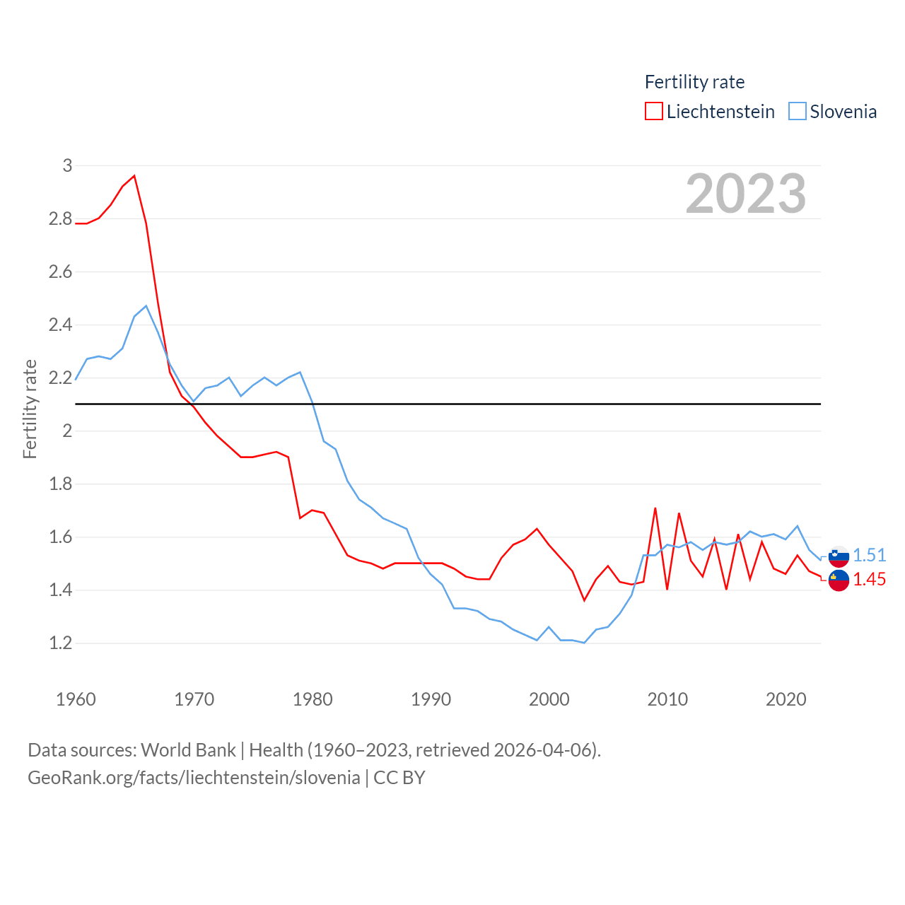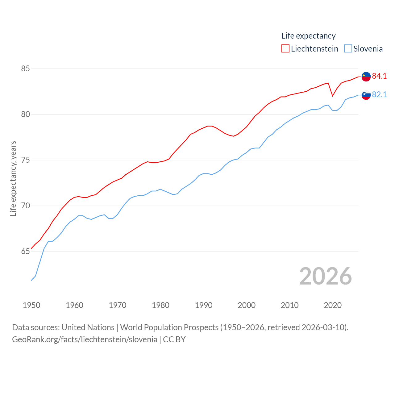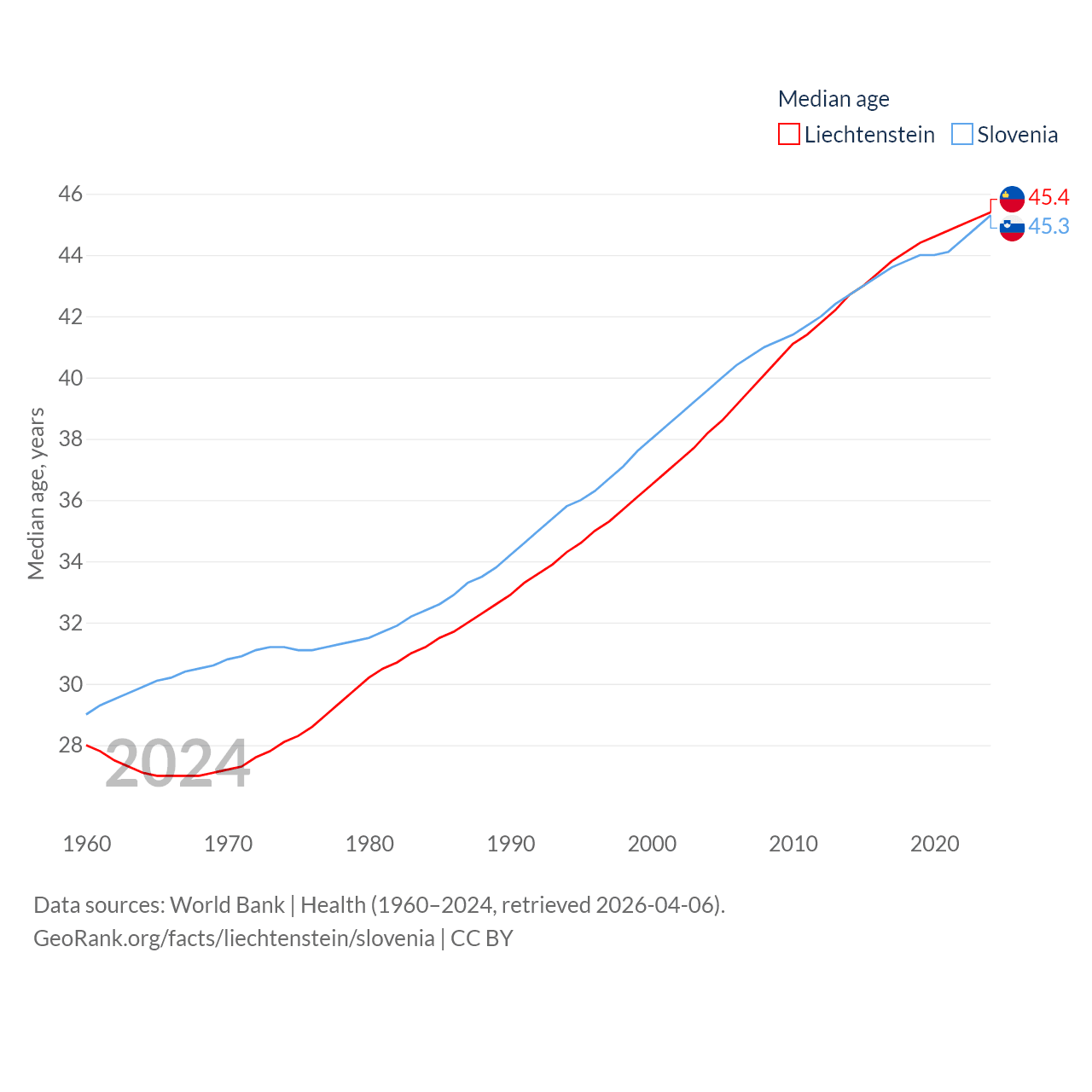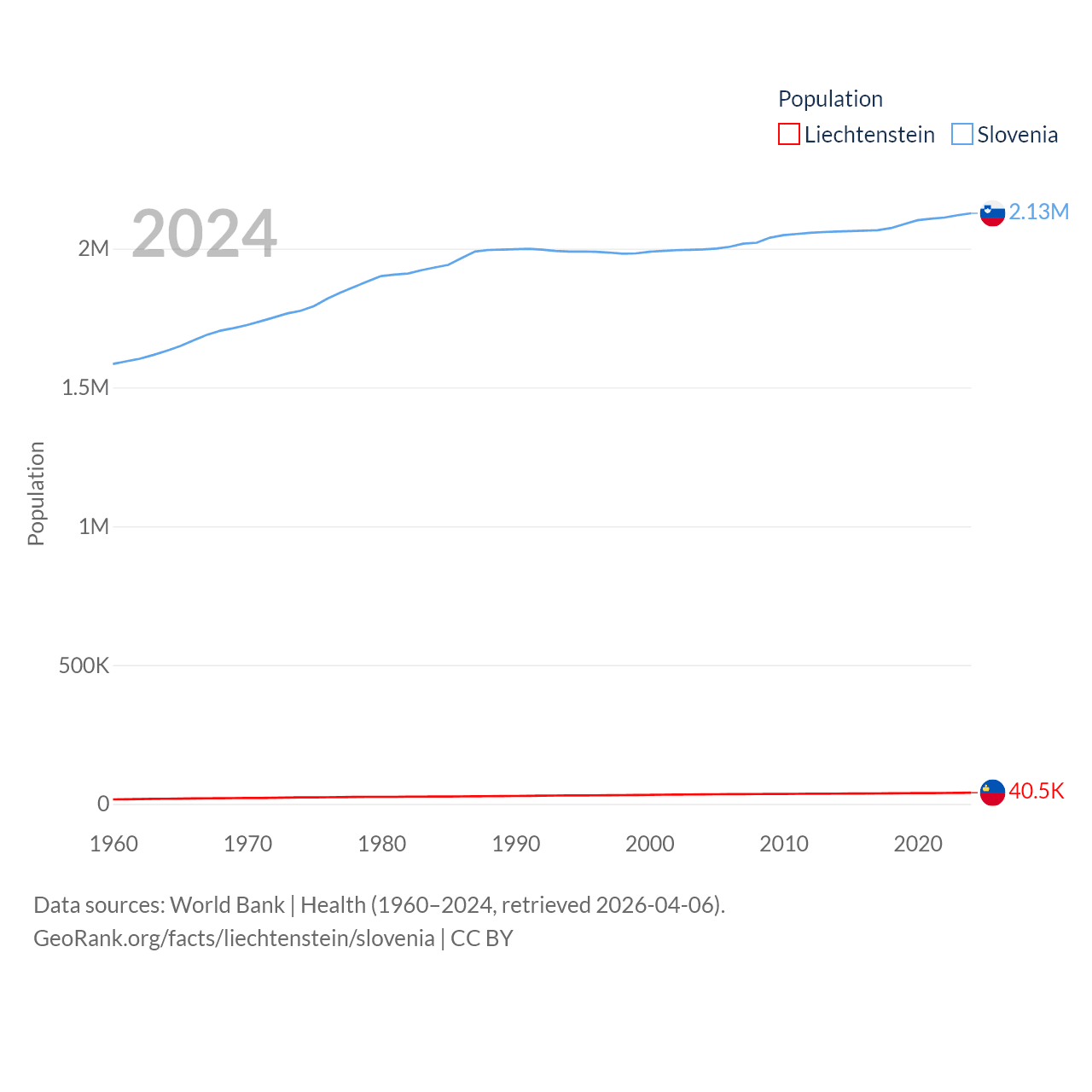 Liechtenstein has a population of 40.4K (ranked 190/197), compared with 2.13M in Slovenia (ranked 147/197). Liechtenstein's land area is 61.8 sq mi versus 7,774 sq mi for Slovenia (ranked 192nd vs. 151st).