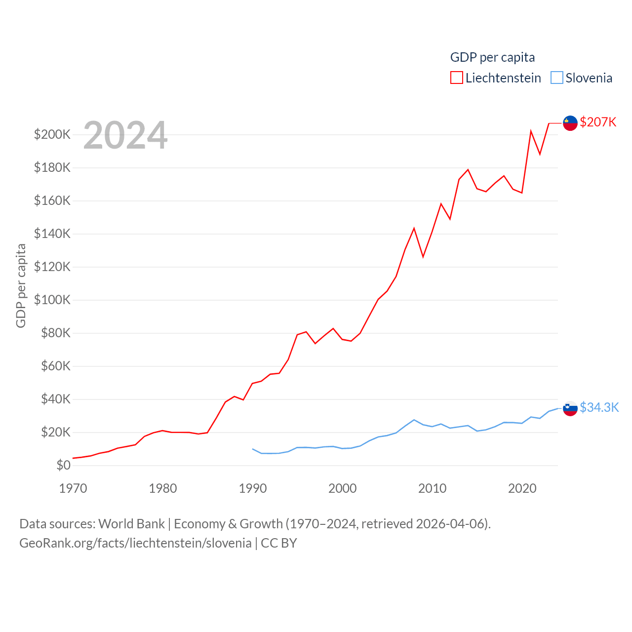 By GDP, Liechtenstein ranks 156/197 ($8.24B) and Slovenia ranks 86/197 ($73B). By GDP per capita, Liechtenstein ranks 2/197 ($206,781), while Slovenia ranks 34/197 ($34,301).