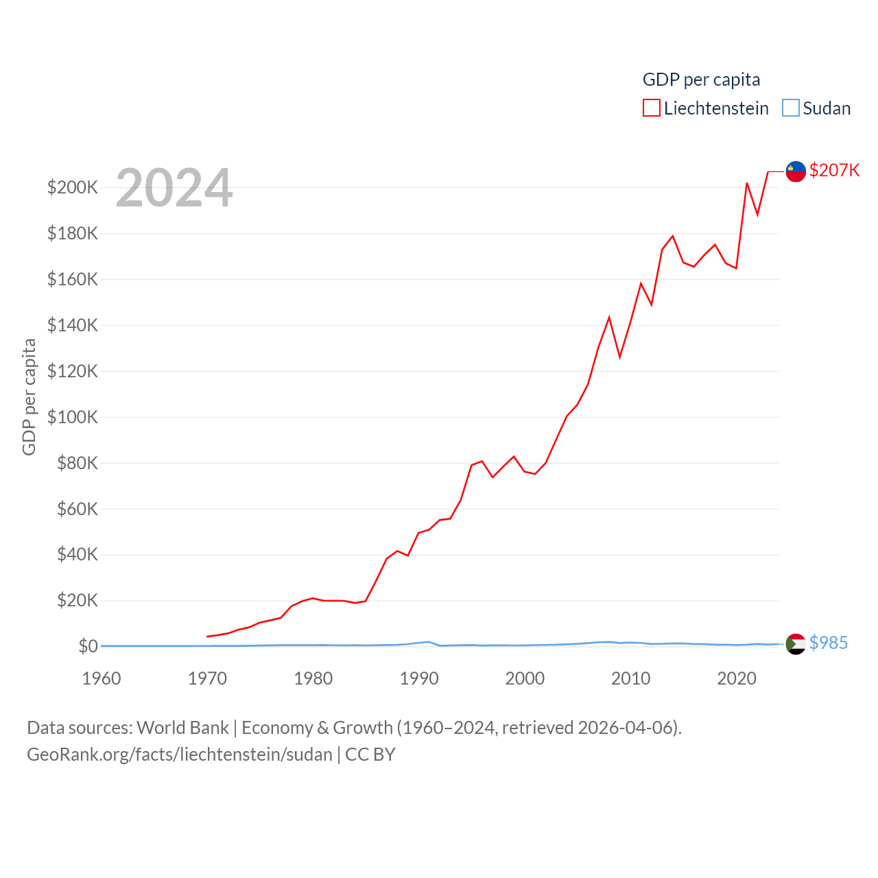 By GDP, Liechtenstein ranks 156/197 ($8.24B) and Sudan ranks 94/197 ($49.7B). By GDP per capita, Liechtenstein ranks 2/197 ($206,781), while Sudan ranks 179/197 ($985).