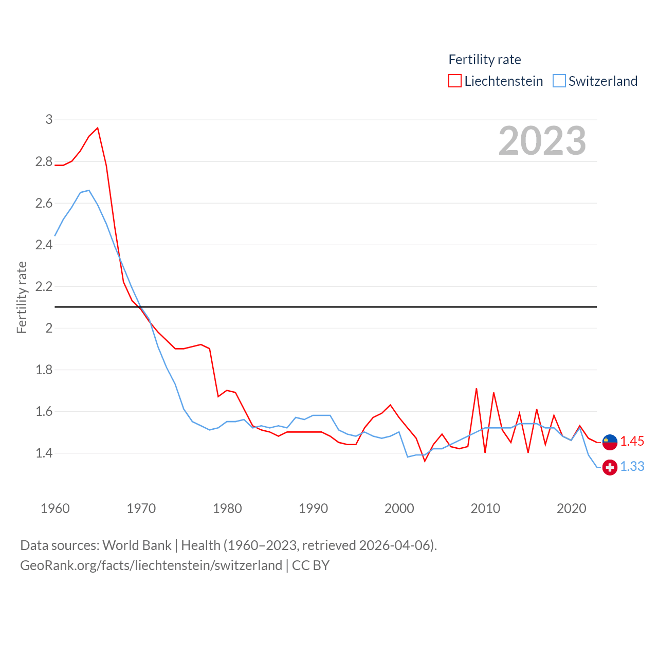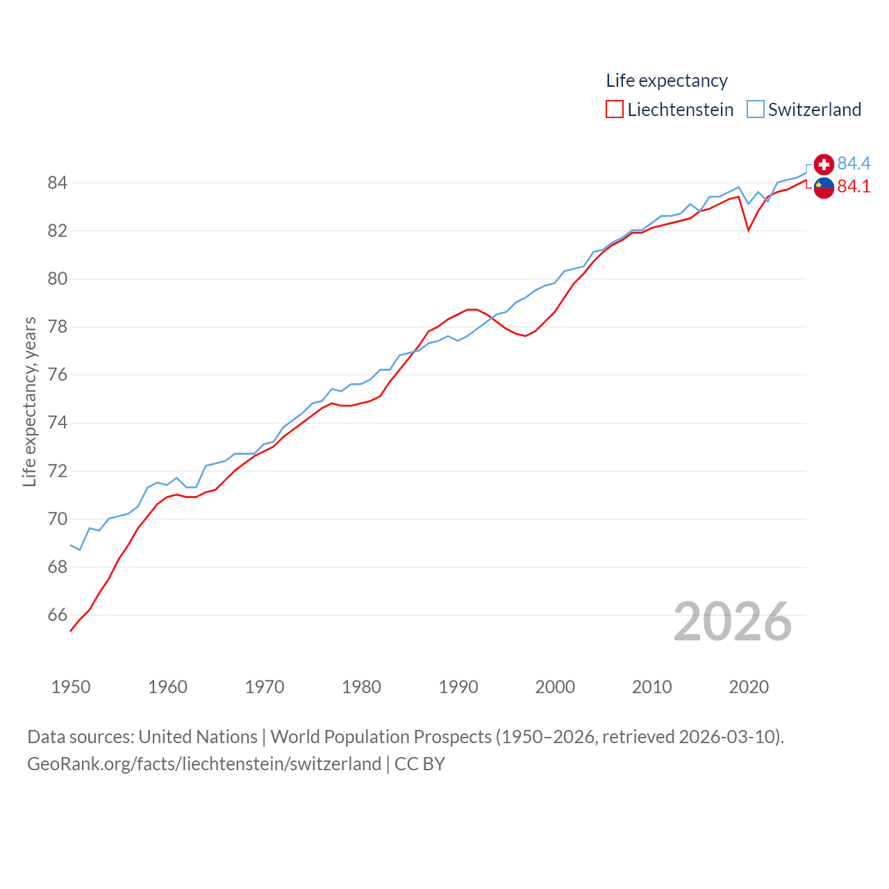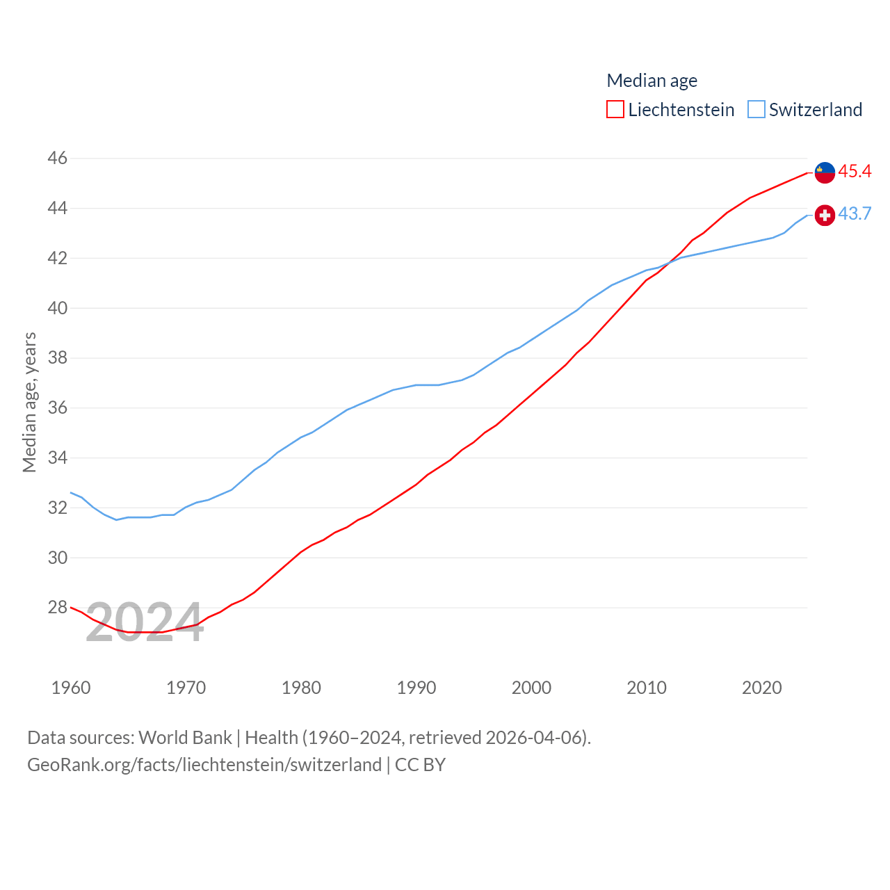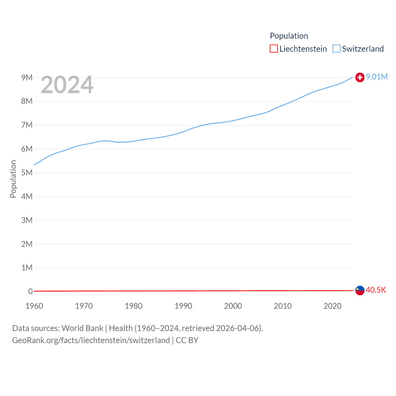 Liechtenstein has a population of 40.4K (ranked 190/197), compared with 9.01M in Switzerland (ranked 101/197). Liechtenstein's land area is 61.8 sq mi versus 15,255 sq mi for Switzerland (ranked 192nd vs. 131st).
