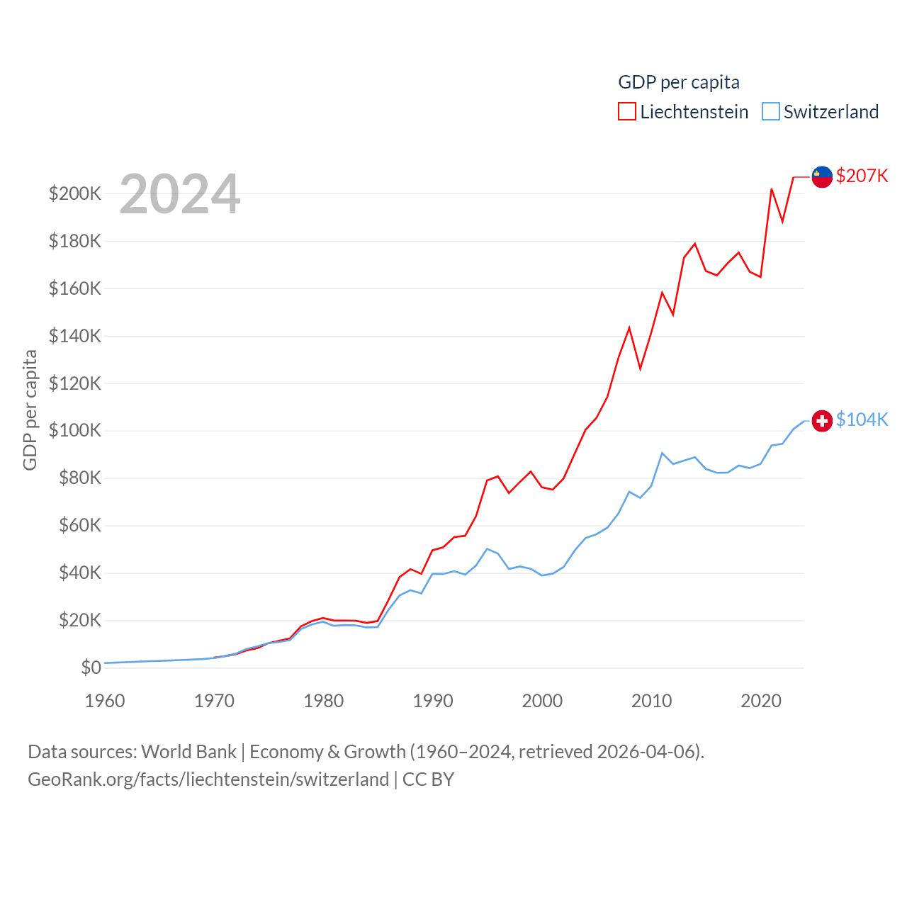 By GDP, Liechtenstein ranks 156/197 ($8.24B) and Switzerland ranks 20/197 ($937B). By GDP per capita, Liechtenstein ranks 2/197 ($206,781), while Switzerland ranks 5/197 ($103,998).