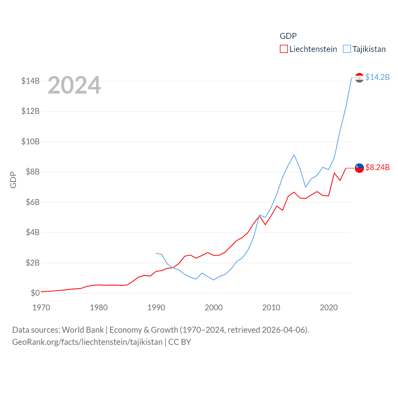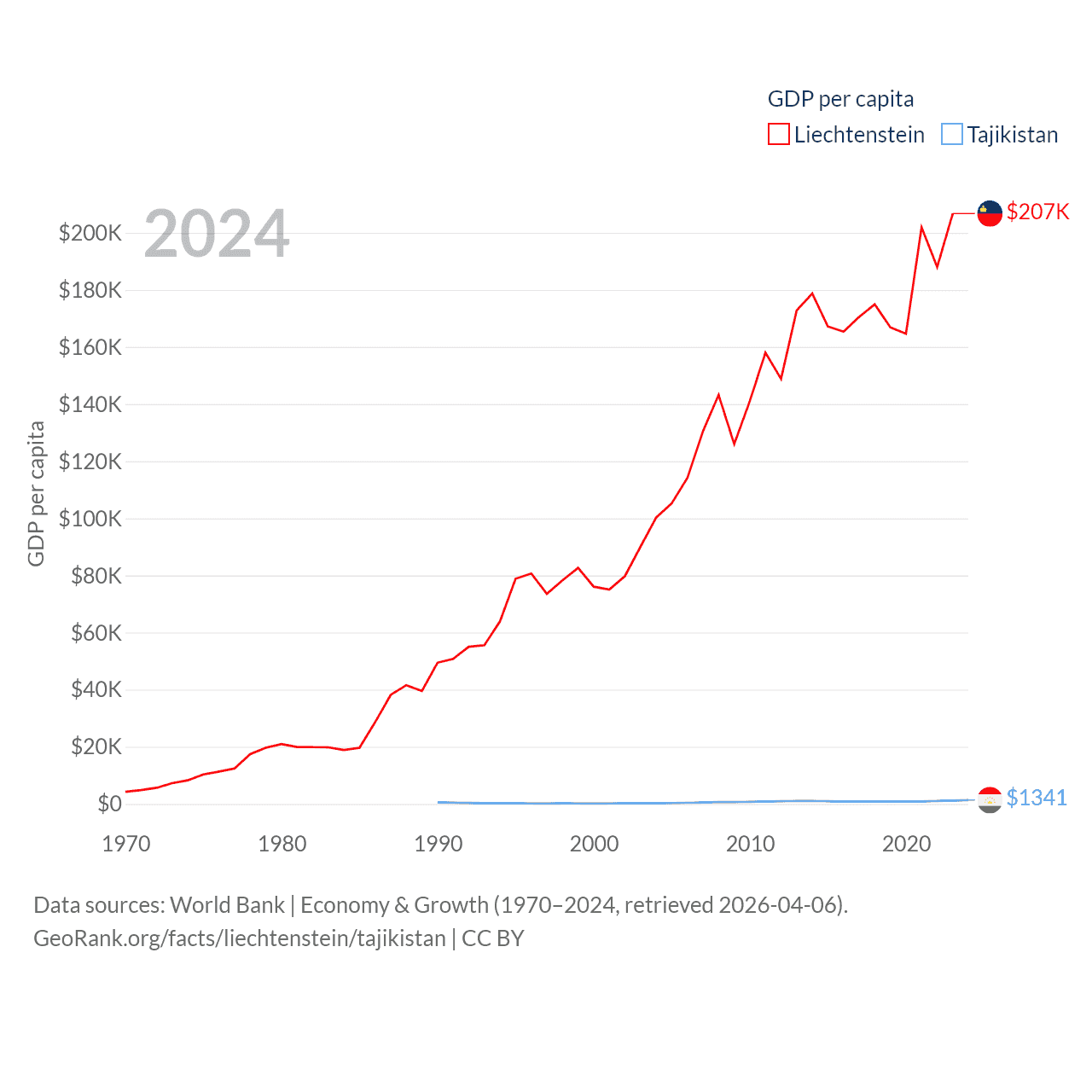 By GDP, Liechtenstein ranks 156/197 ($8.24B) and Tajikistan ranks 145/197 ($14.2B). By GDP per capita, Liechtenstein ranks 2/197 ($206,781), while Tajikistan ranks 166/197 ($1,341).