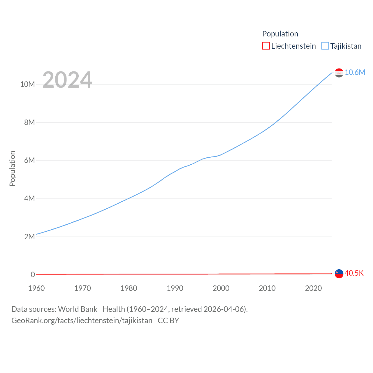 Liechtenstein has a population of 40.4K (ranked 190/197), compared with 10.6M in Tajikistan (ranked 91/197). Liechtenstein's land area is 61.8 sq mi versus 53,587 sq mi for Tajikistan (ranked 192nd vs. 93rd).