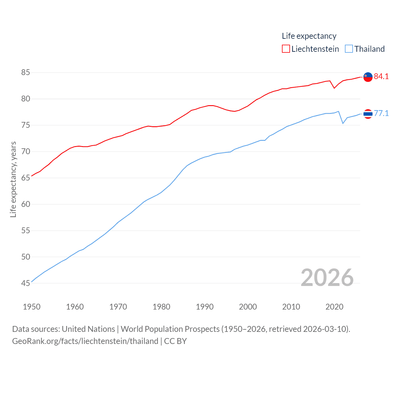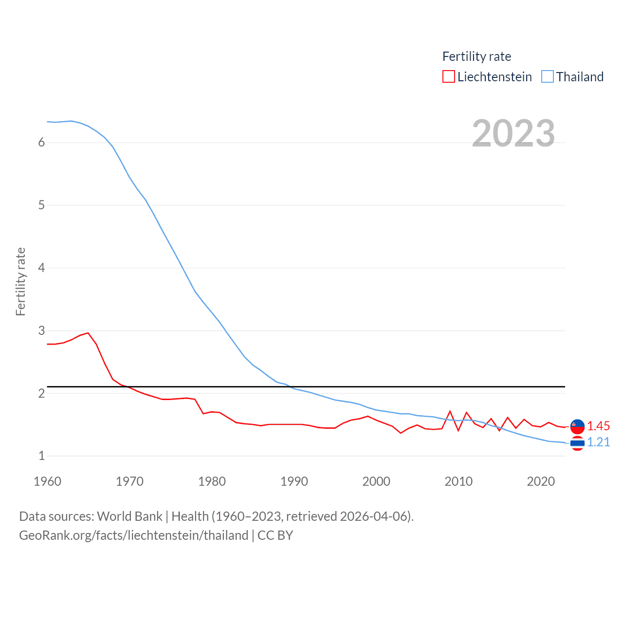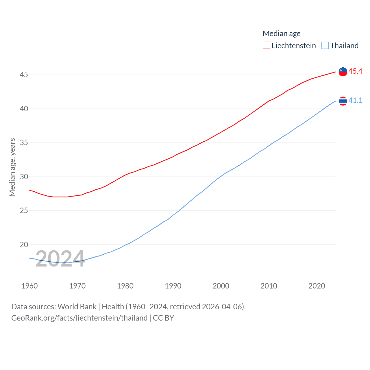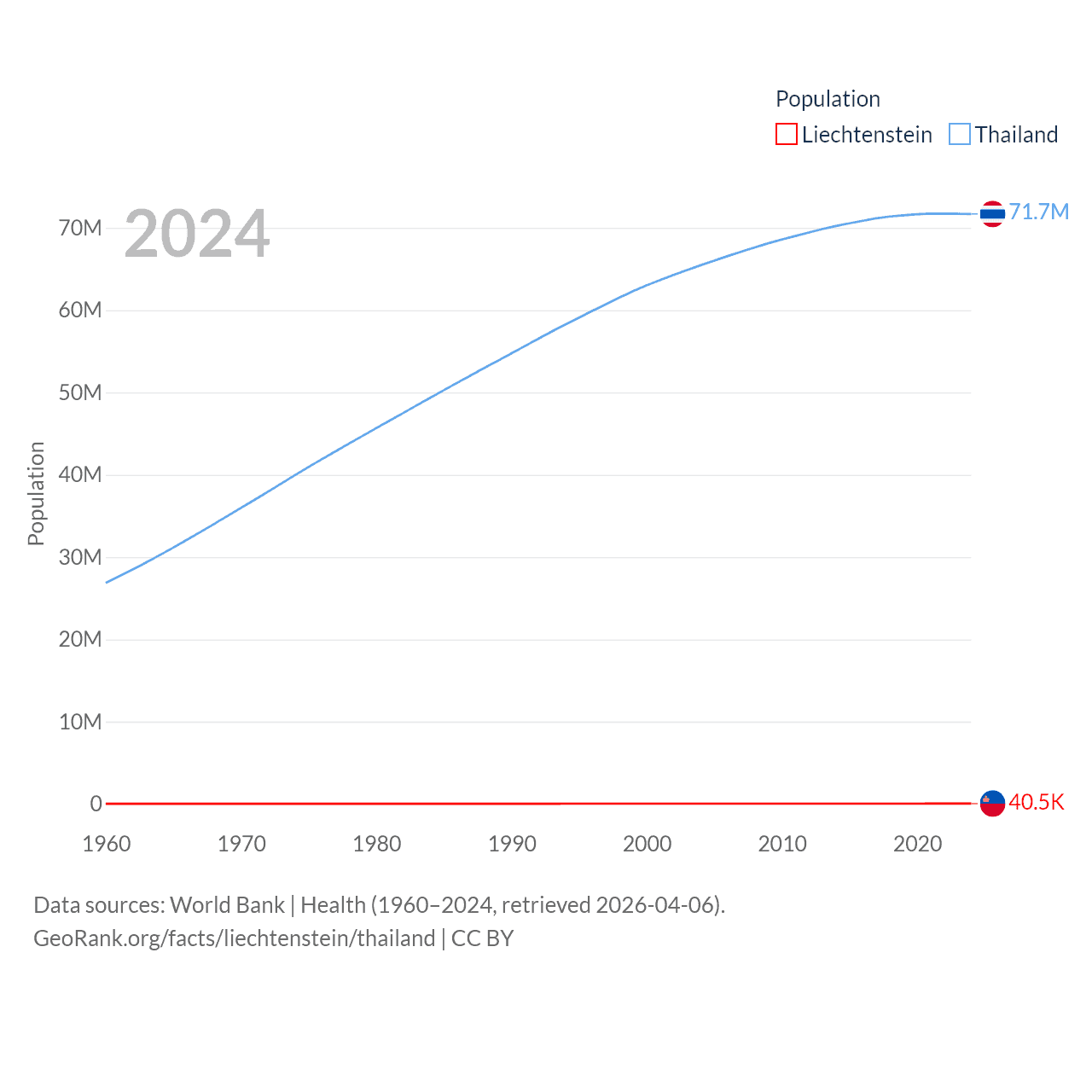 Liechtenstein has a population of 40.4K (ranked 190/197), compared with 71.7M in Thailand (ranked 20/197). Liechtenstein's land area is 61.8 sq mi versus 197,256 sq mi for Thailand (ranked 192nd vs. 50th).