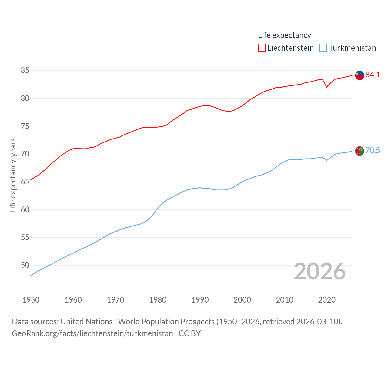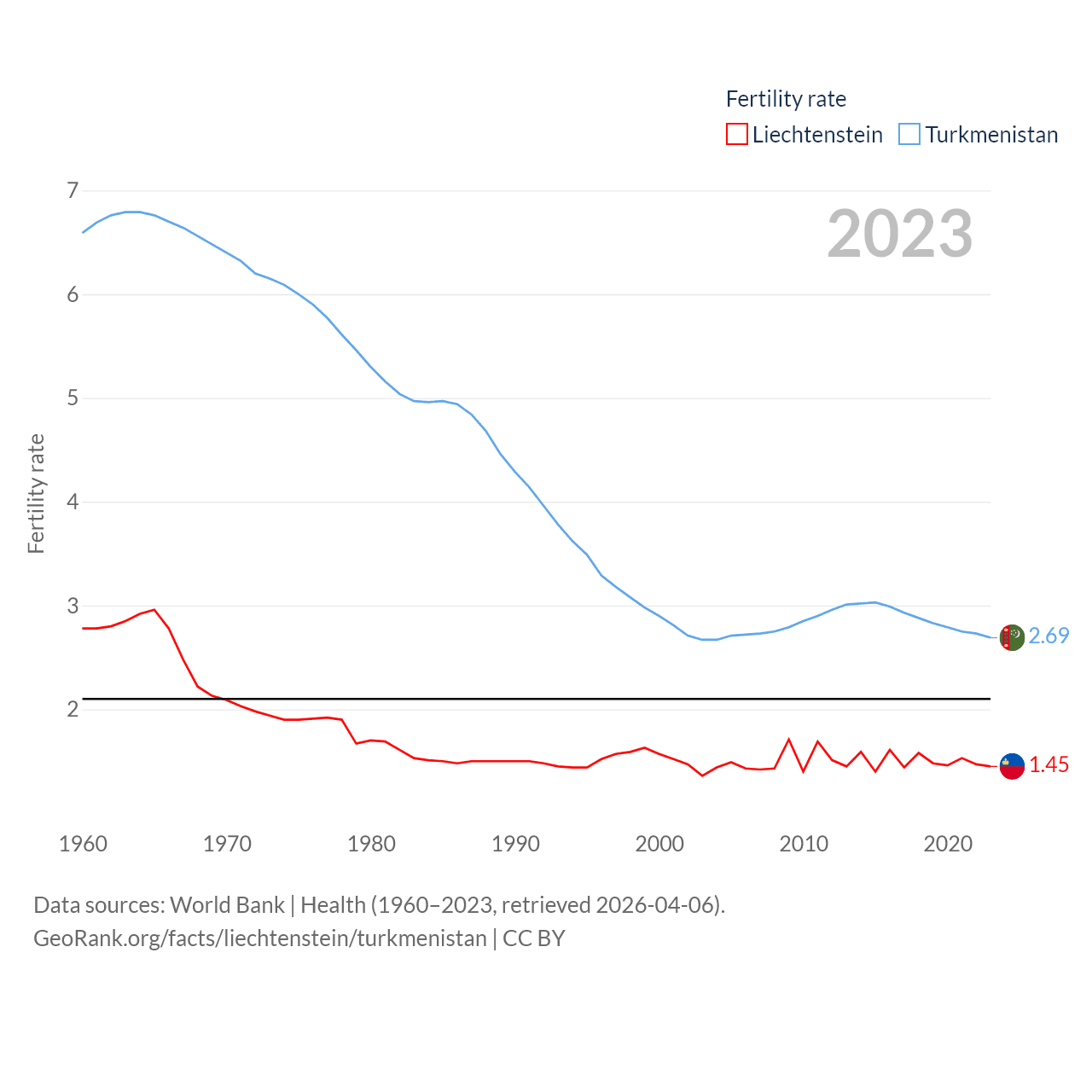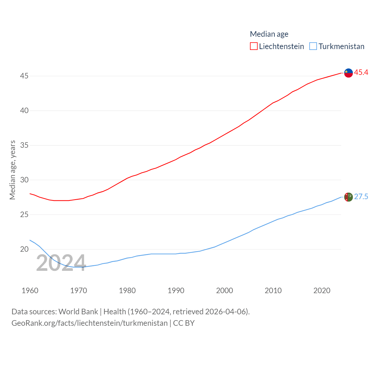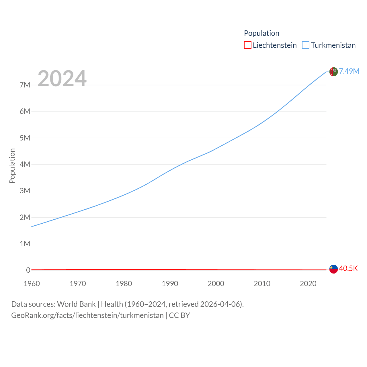 Liechtenstein has a population of 40.4K (ranked 190/197), compared with 7.49M in Turkmenistan (ranked 104/197). Liechtenstein's land area is 61.8 sq mi versus 181,441 sq mi for Turkmenistan (ranked 192nd vs. 53rd).