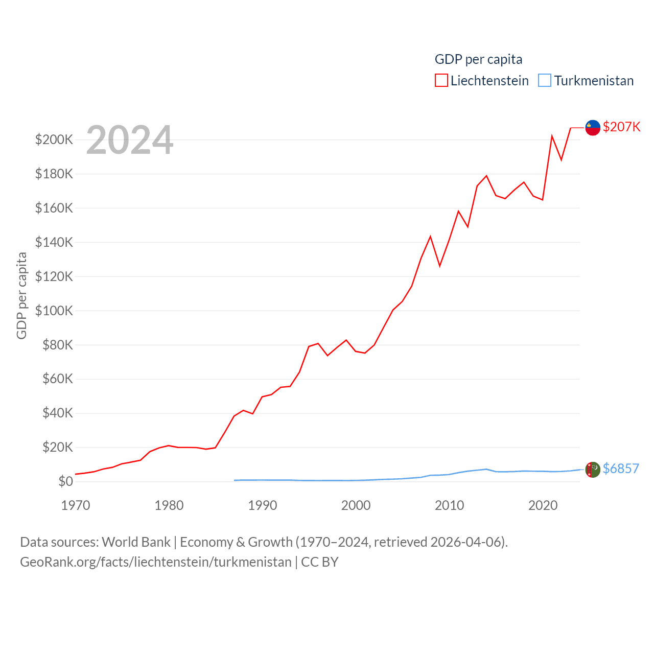 By GDP, Liechtenstein ranks 156/197 ($8.24B) and Turkmenistan ranks 92/197 ($51.4B). By GDP per capita, Liechtenstein ranks 2/197 ($206,781), while Turkmenistan ranks 104/197 ($6,857).