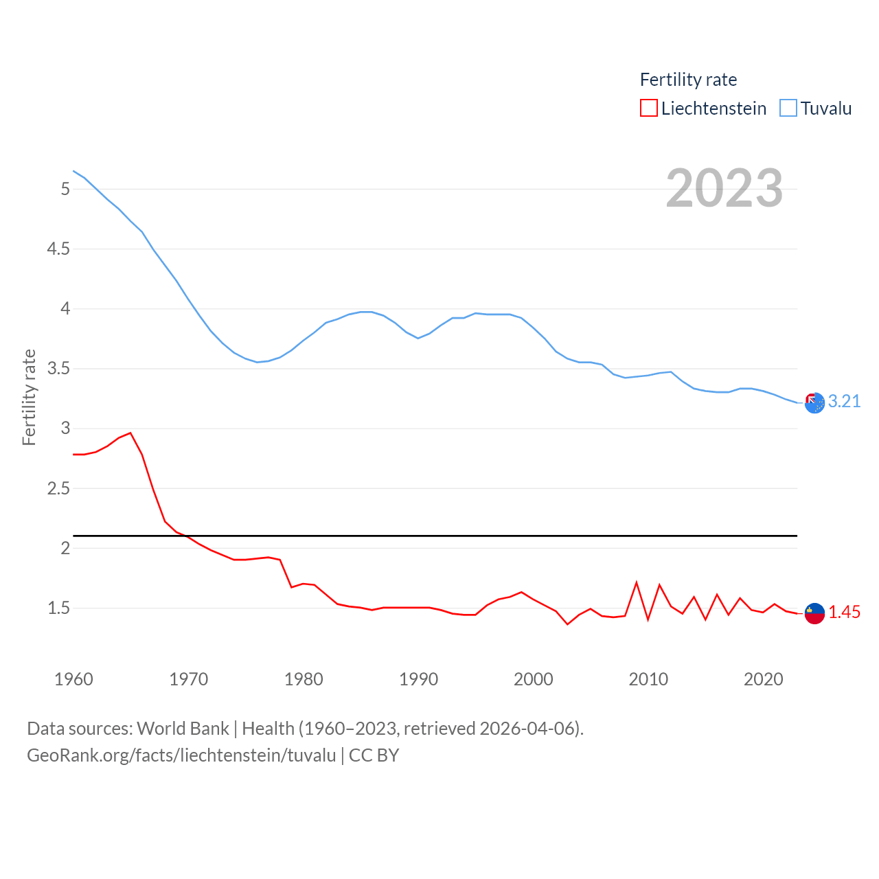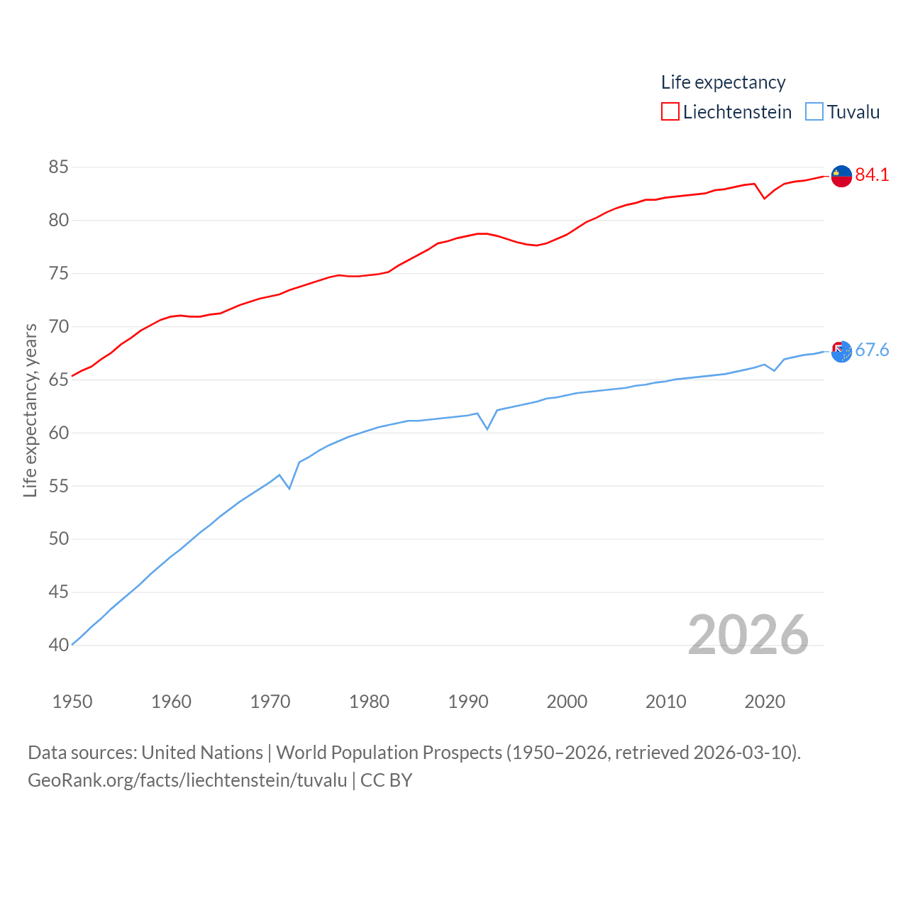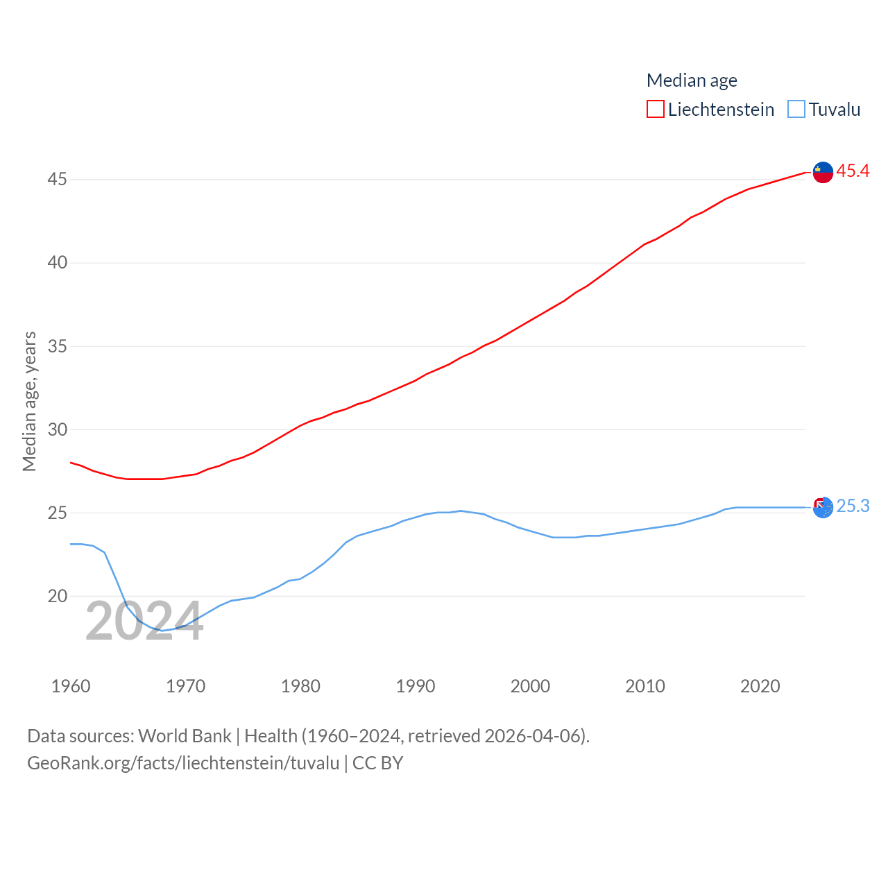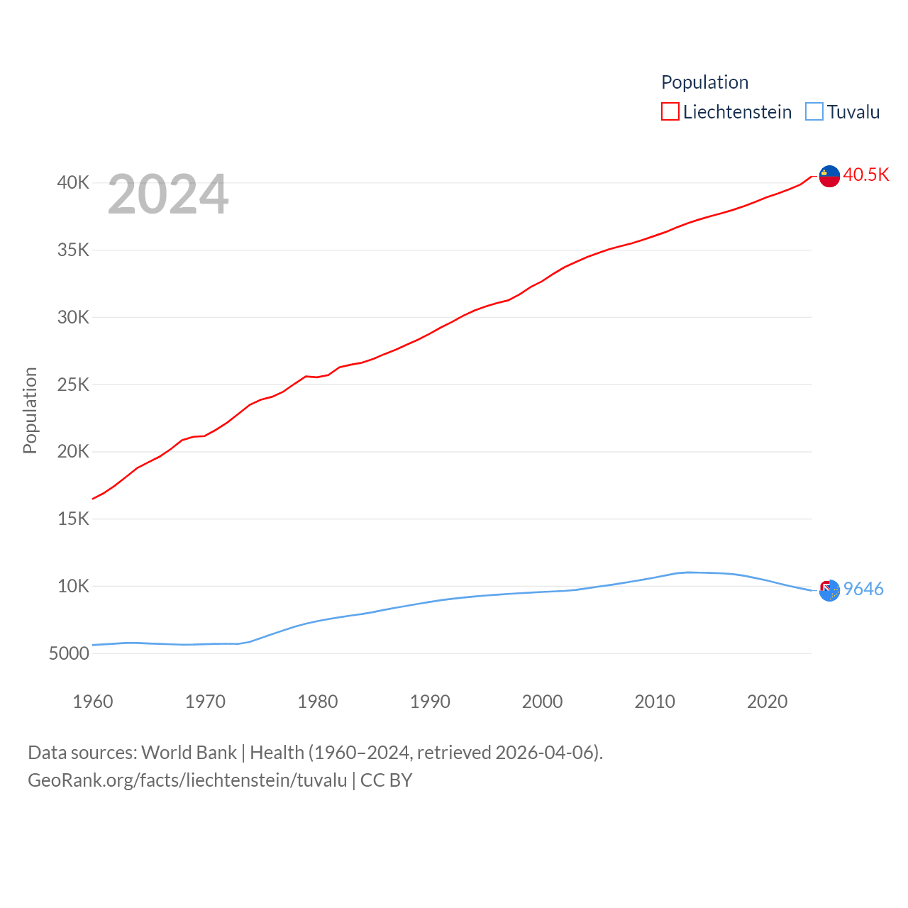 Liechtenstein has a population of 40.4K (ranked 190/197), compared with 9.65K in Tuvalu (ranked 196/197). Liechtenstein's land area is 61.8 sq mi versus 11.6 sq mi for Tuvalu (ranked 192nd vs. 194th).